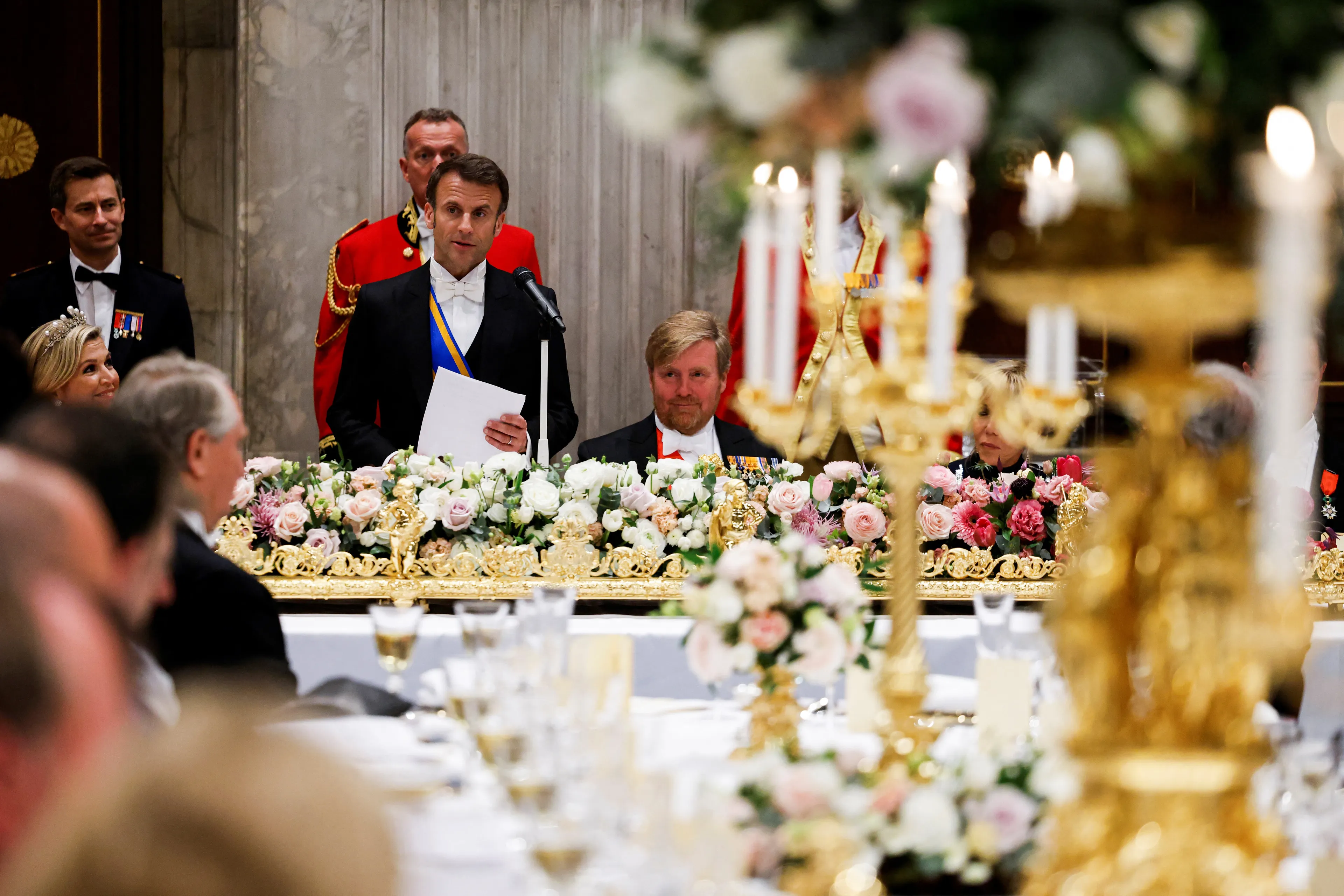 Macron begon zijn toespraak door te stellen dat hij en zijn vrouw Brigitte dinsdag "op een fantastische manier" onthaald zijn. Hij noemde dat een "eer voor zijn hele land". Ook sprak Macron op zijn beurt waardering uit voor het feit dat koning Willem-Alexander zijn speech even daarvoor geheel in het Frans deed.