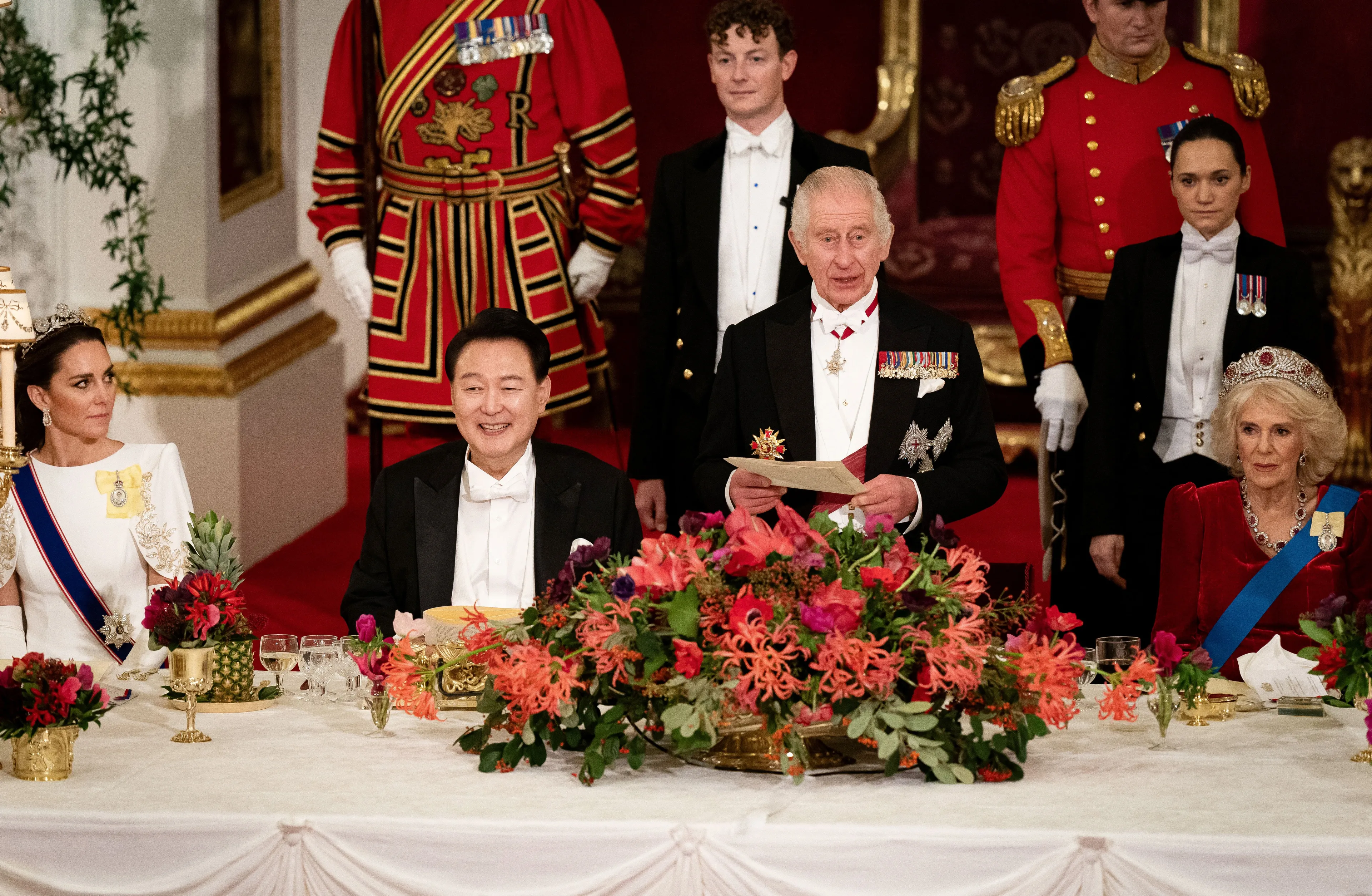 De eerste dag van het staatsbezoek van president Yoon Suk-yeol aan het Verenigd Koninkrijk werd traditiegetrouw afgesloten. Op Buckingham Palace in Londen ontving koning Charles zijn gasten voor een staatsbanket. Dat hoefde hij niet alleen te doen, want ook koningin Camilla, prins William en zijn vrouw Catherine waren bij het diner aanwezig. Evenals prinses Anne en Sophie, de echtgenote van prins Edward.
