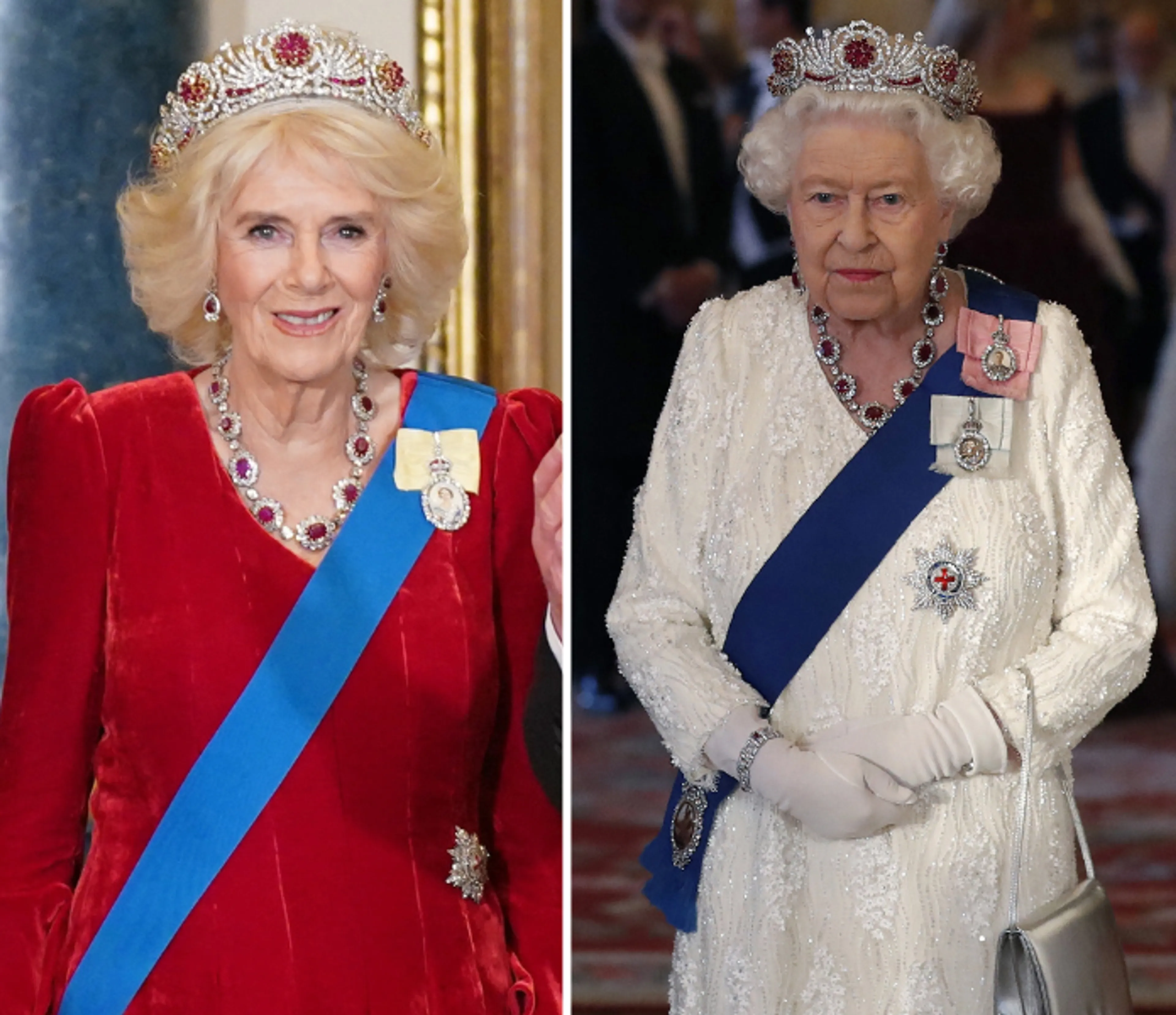 Koningin Camilla verscheen in een rode avondjurk bij het staatsbanket. De nieuwe japon is een ontwerp van Fiona Clare. Camilla droeg bijpassende juwelen bij haar rode outfit. De diadeem en halsketting werden ook gedragen door koningin Elizabeth II.