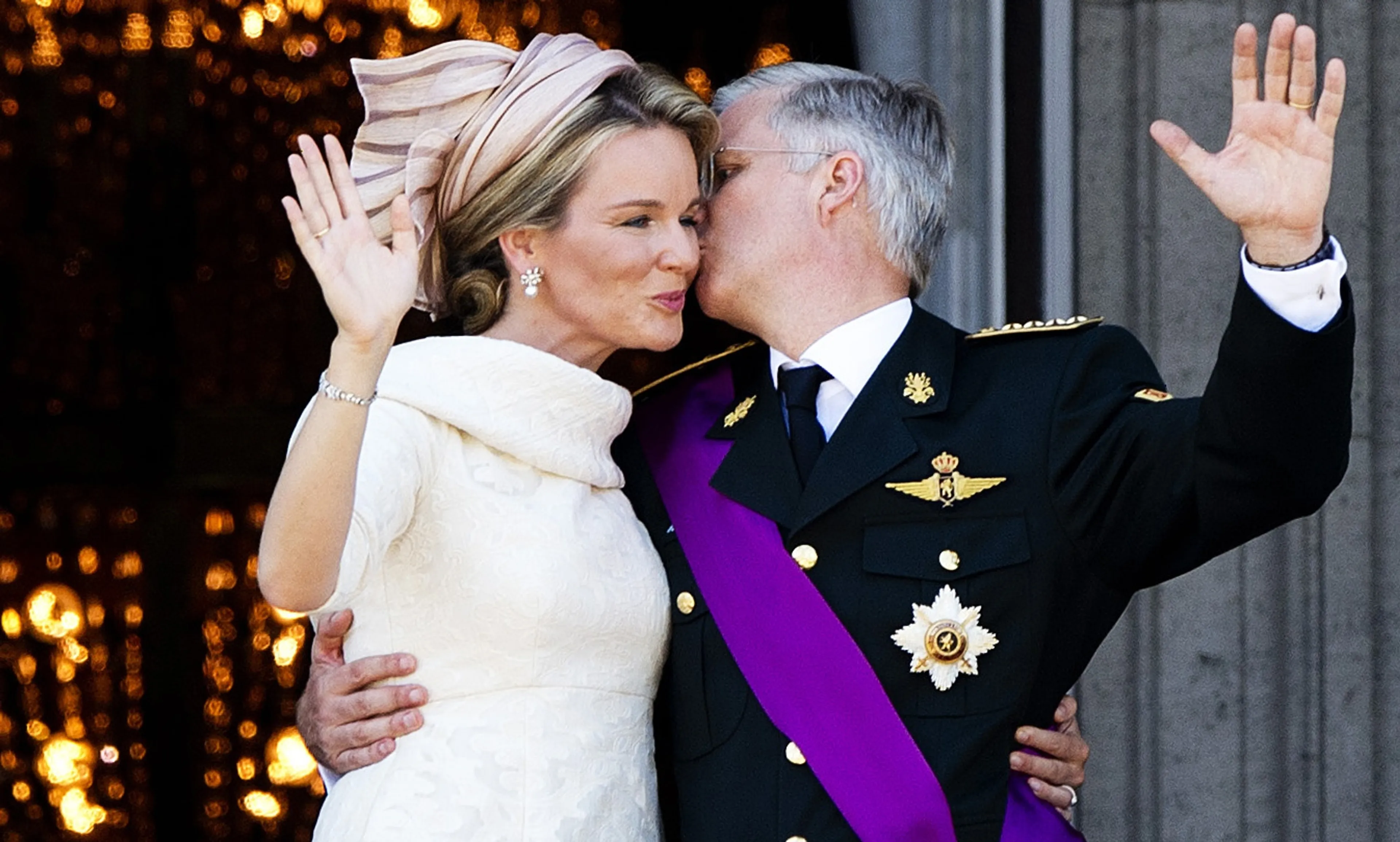 Tijdens de balkonsessie voor de Belgische Nationale feestdag in 2013 geeft koning Filip een zeldzame kus op de wang van zijn vrouw Mathilde.