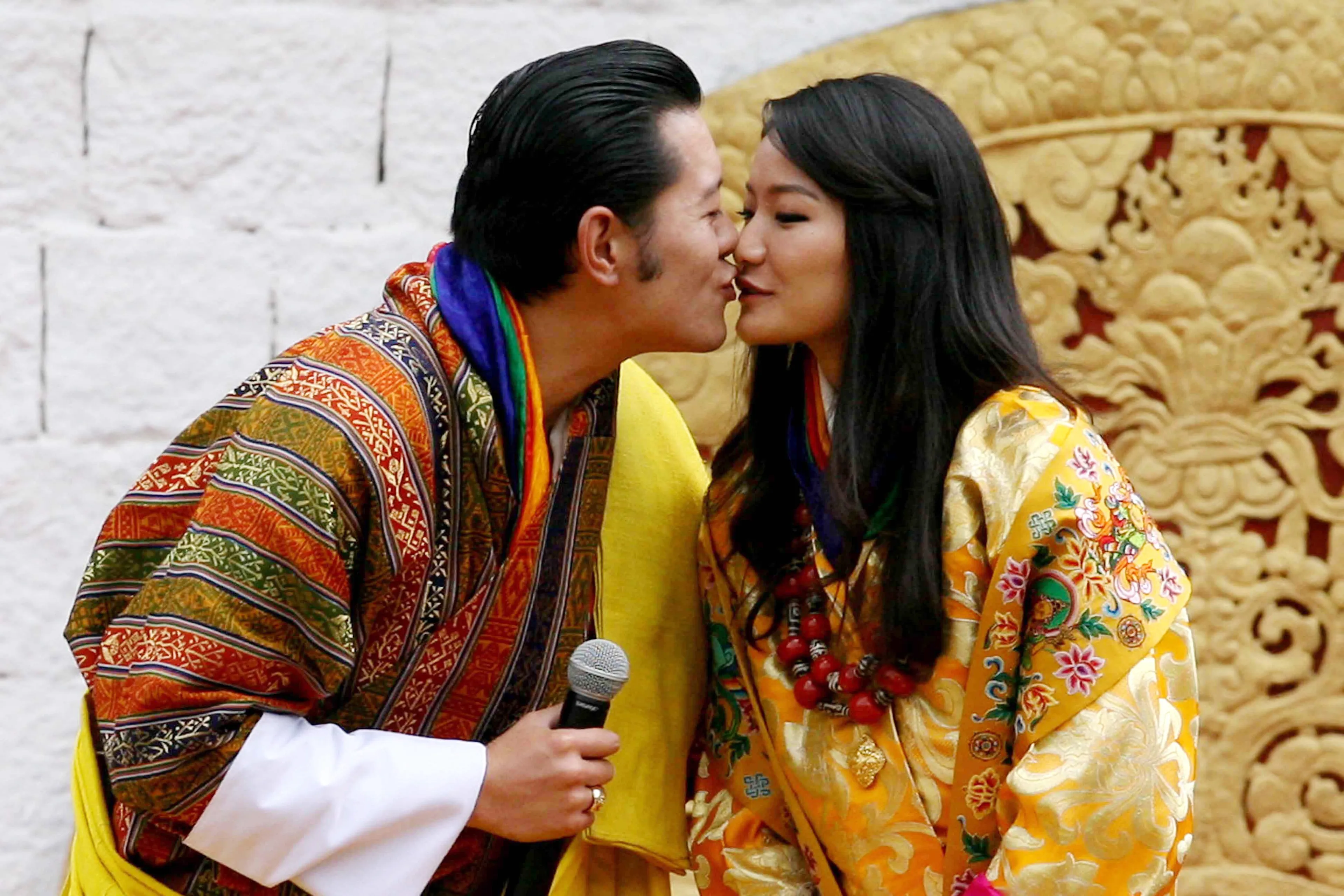 Koning Jigme Khesar en koningin Jetsun Pema van Bhutan zijn erg dol op elkaar. Zo zijn ze op dit moment in verwachting van hun derde kindje. Het gelukkige stel deelt hier een kus na hun bruiloft in 2011.