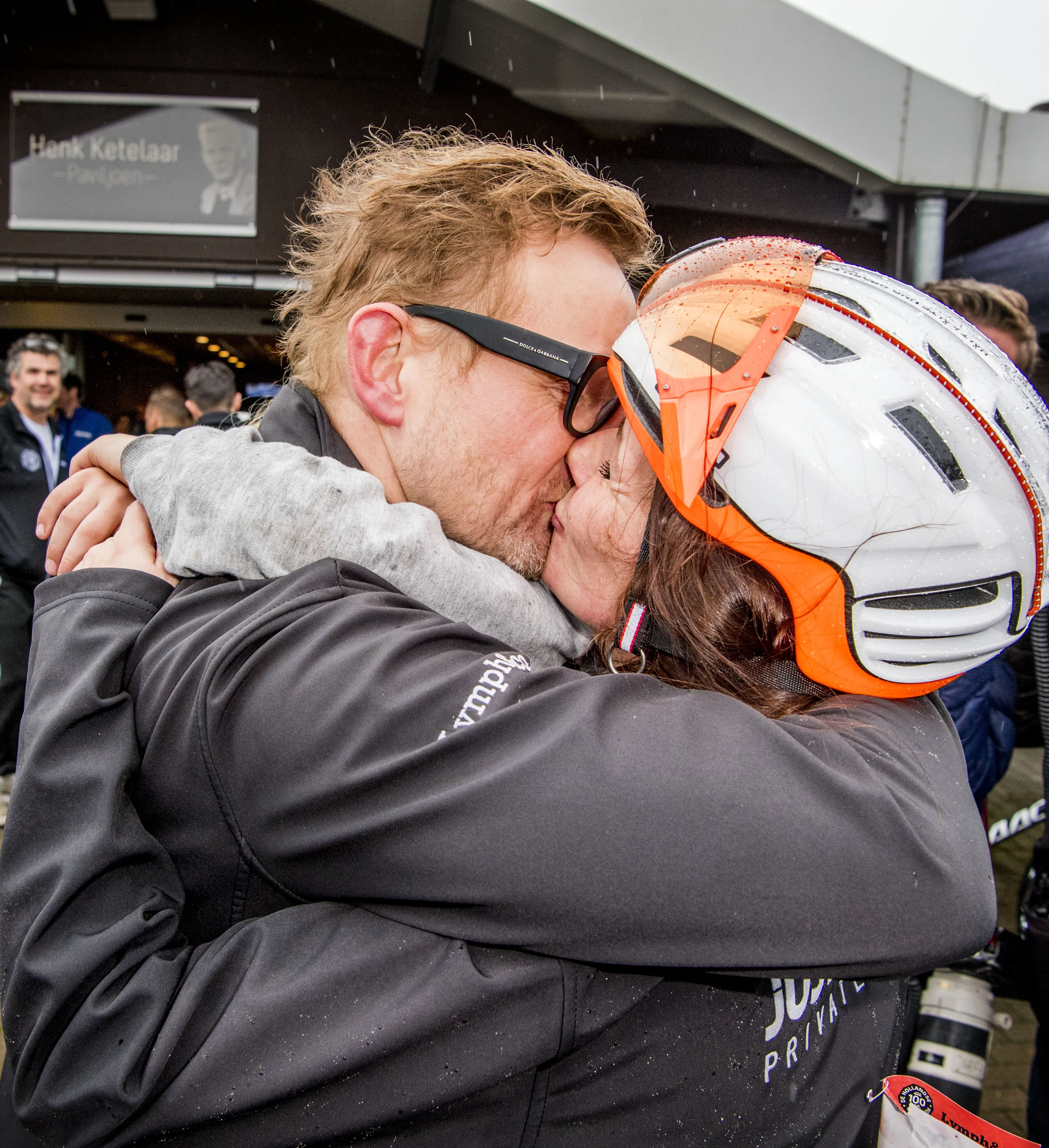 Prins Bernhard kust zijn geliefde vrouw Annette hier euforisch op de mond na afloop van zijn ronde tijdens de Hollandse 100, een schaats- en fietsevenement om geld in te zamelen voor onderzoek naar lymfklierkanker. De twee zijn vandaag ook nog eens 23 jaar getrouwd, bekijk hier de mooiste foto's van hun huwelijk.