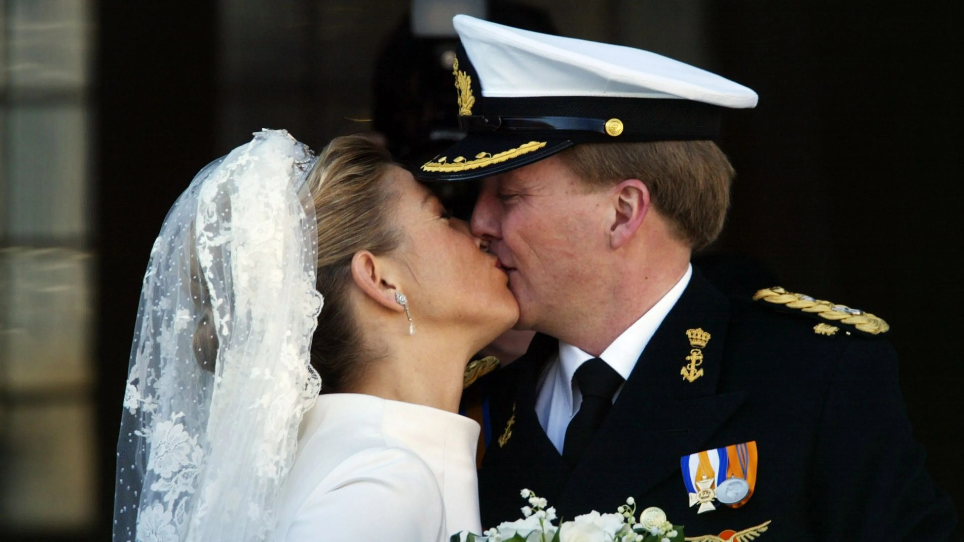 Koning Willem-Alexander en koningin Máxima delen na de voltrekking van hun huwelijk in 2002 een lieve kus. De twee zijn 21 jaar later nog even dol op elkaar.