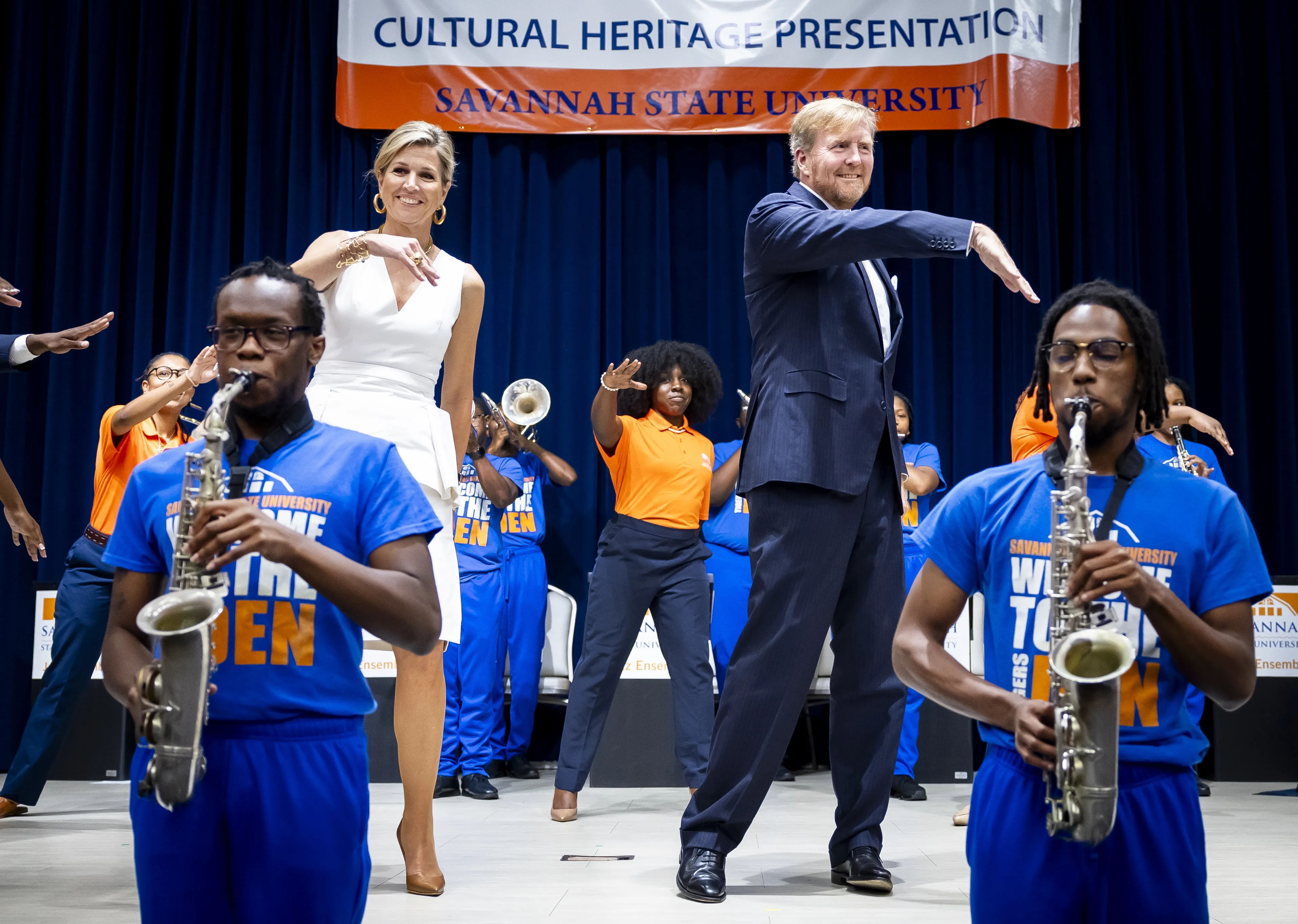 Daarna bracht het koningspaar een bezoek aan de Savannah State University, waar ze getrakteerd werden op een muzikaal optreden. Na afloop werden ze het podium op gevraagd, waar ze een dansje deden op de swingende muziek van de studenten. Vooral koning Willem-Alexander leek het uitstekend naar zijn zin te hebben en zwaaide uitbundig met zijn armen.