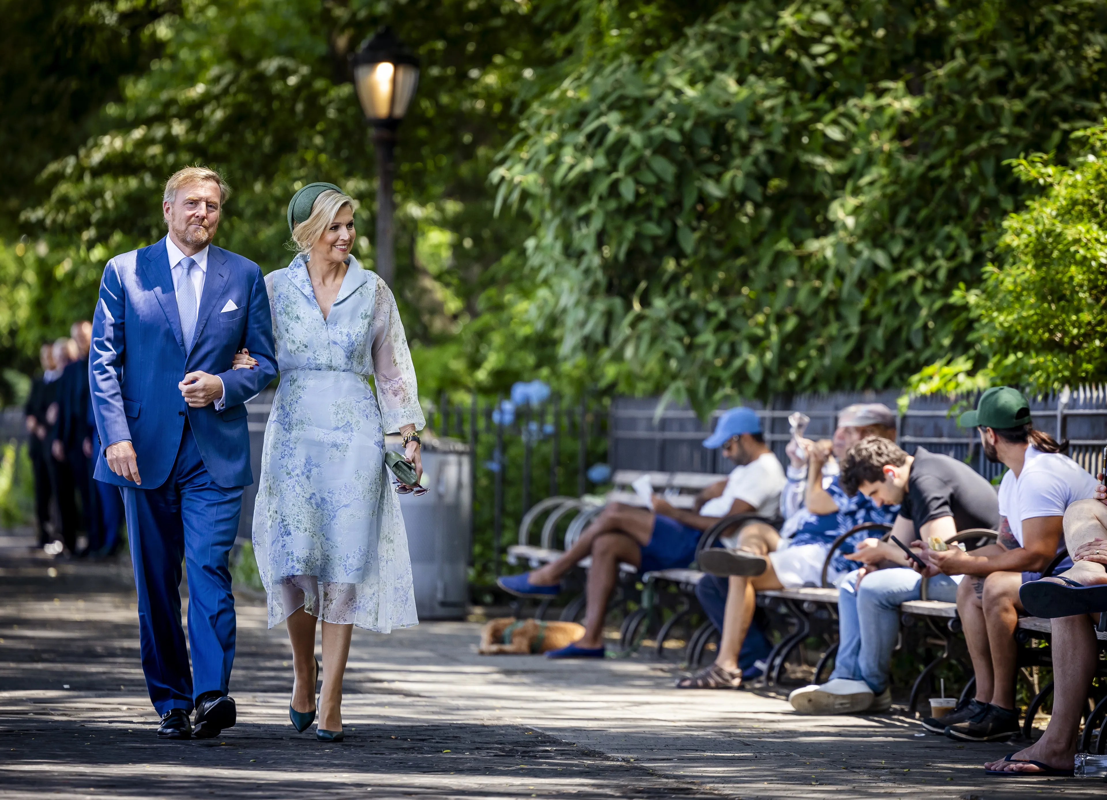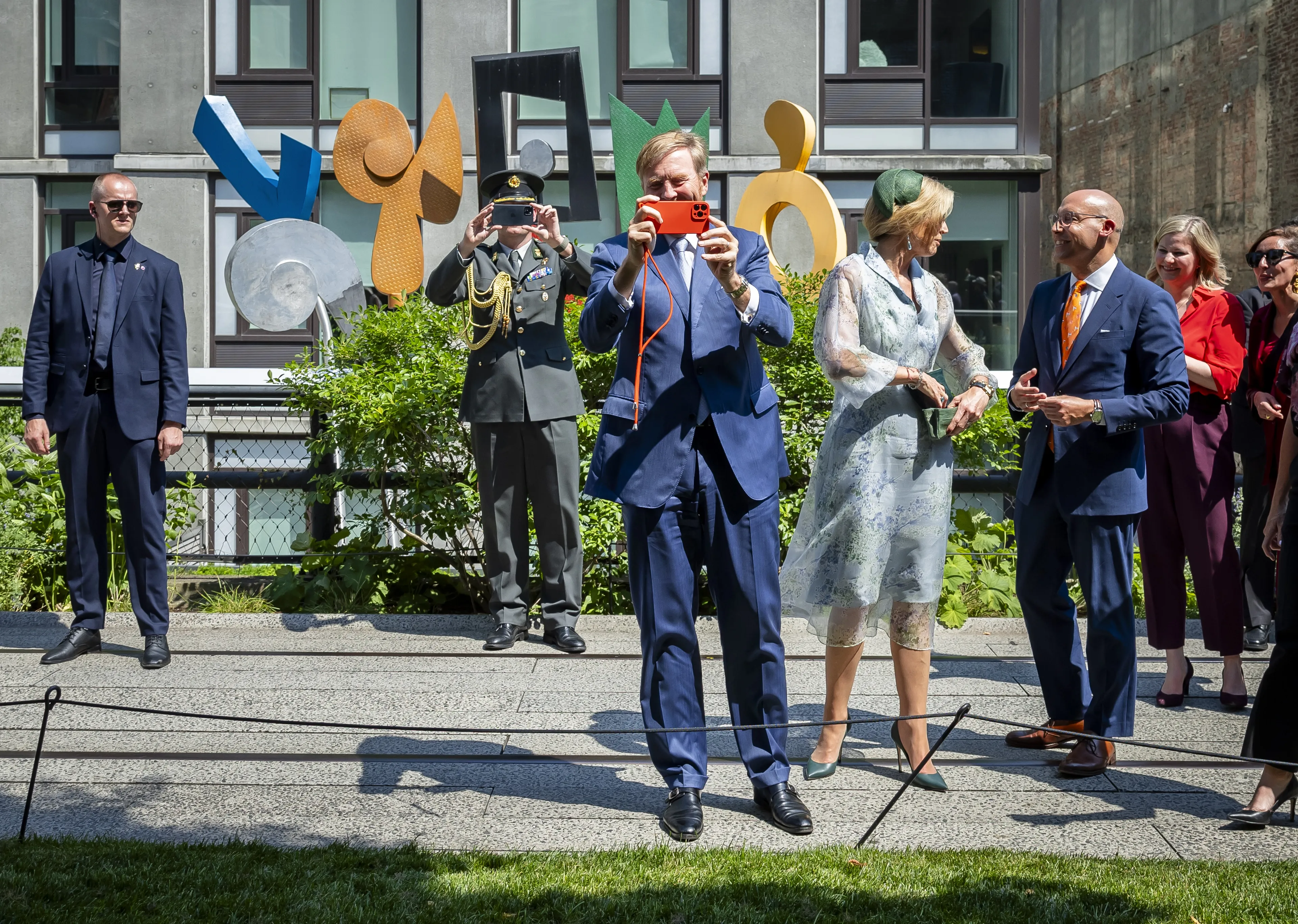 Koning Willem-Alexander was tijdens een wandeling over de High Line in een jolige bui. Aan het einde van de wandeling draaide de koning de rollen om en nam zelf een aantal foto's van de meereizende pers. De journalisten hadden tijdens de lange wandeling even plaatsgenomen in de schaduw, waarvan een foto werd gemaakt. Het koningspaar kwam vol verbazing voorbij gewandeld. "Zo, lekker hard werken voor jullie heren en dames", riep de koning lachend. Daarop nam hij een telefoon van een fotograaf om een foto te nemen van het gezelschap. Ook koningin Máxima pakte haar telefoon erbij om een foto te maken.
