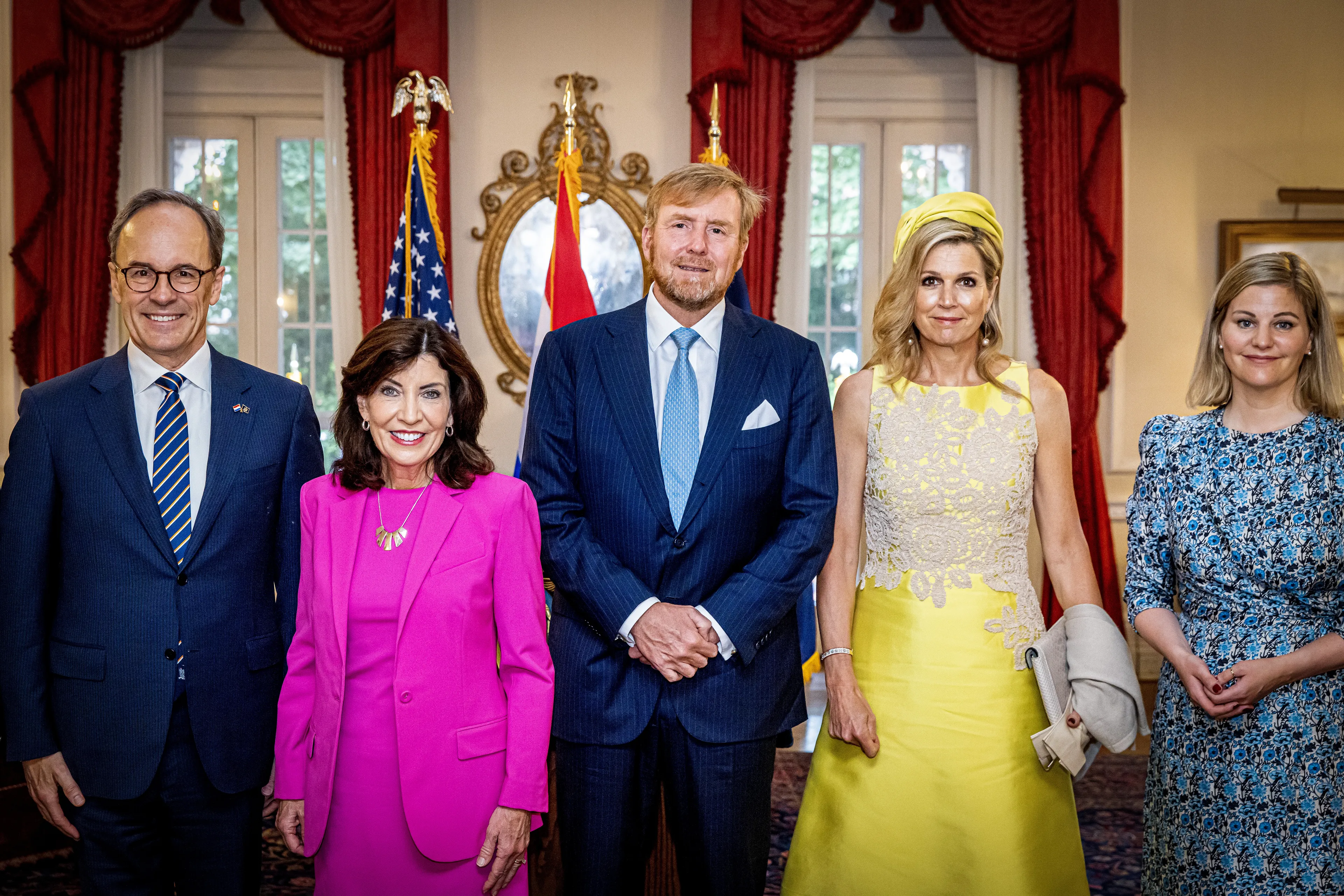 Dag drie van het werkbezoek aan de Verenigde Staten ging verder in de staat New York. Woensdag was het koningspaar in Albany, waar ze gouverneur Kathy Hochul van New York ontmoetten. Koningin Máxima was voor de gelegenheid helemaal in het geel gekleed. De jurk hebben we eerder gezien tijdens een bezoek aan Saba in 2017 en is van modehuis Natan.