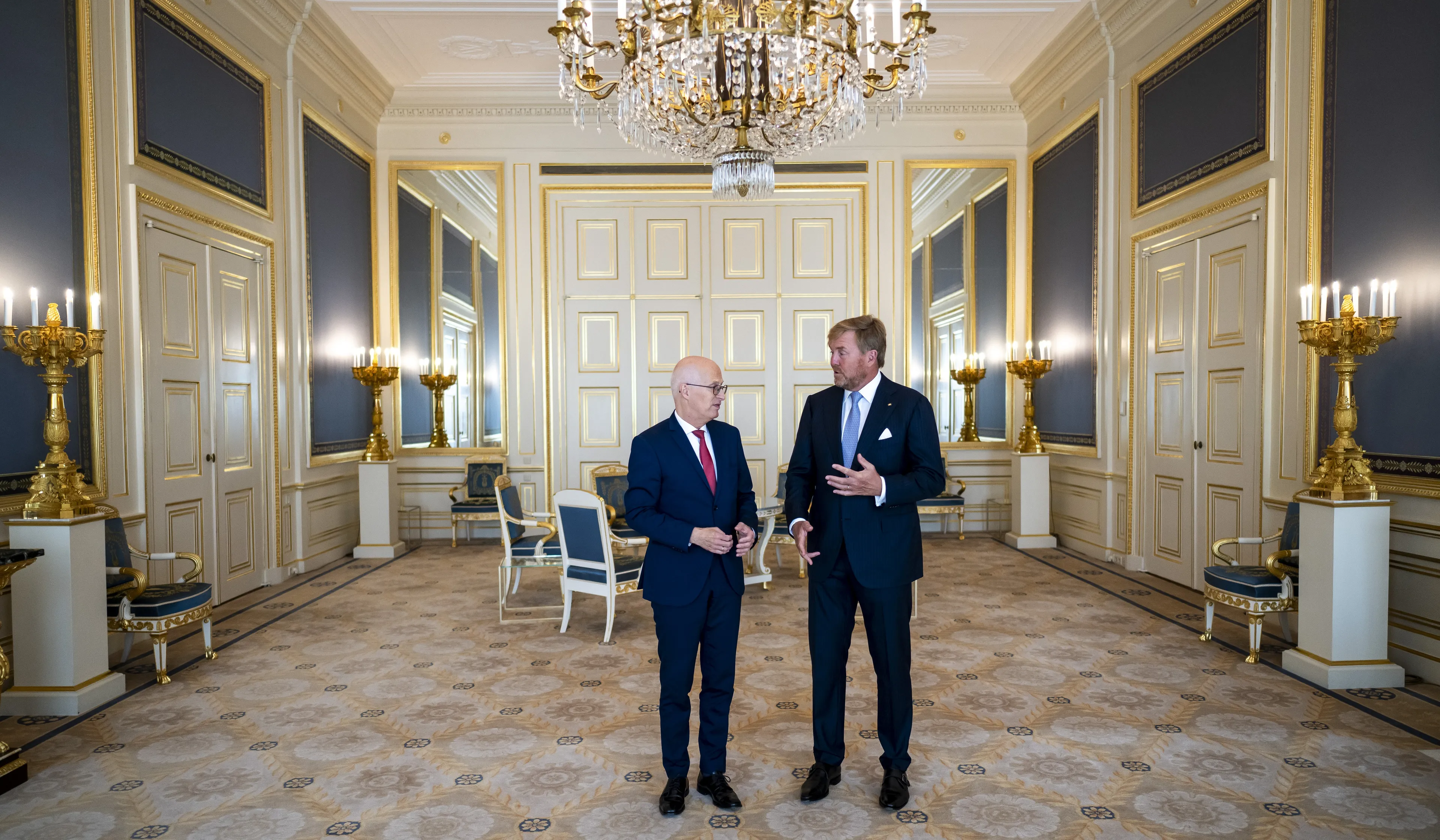 Na de inontvangstneming van de geloofsbrieven maakt koning Willem-Alexander zich klaar voor het volgende punt op de agenda. Hier hoort ook een kledingwissel bij. Voor audiënties hoeft de koning namelijk geen jacquet aan. Rond 12:00 uur arriveert de Duitse Bondsraadvoorzitter Peter Tschentscher bij het Haagse paleis. In de Balkonkamer wacht koning Willem-Alexander de genodigde op. Na een kort fotomoment worden de gesprekken verder achter gesloten deuren gevoerd.