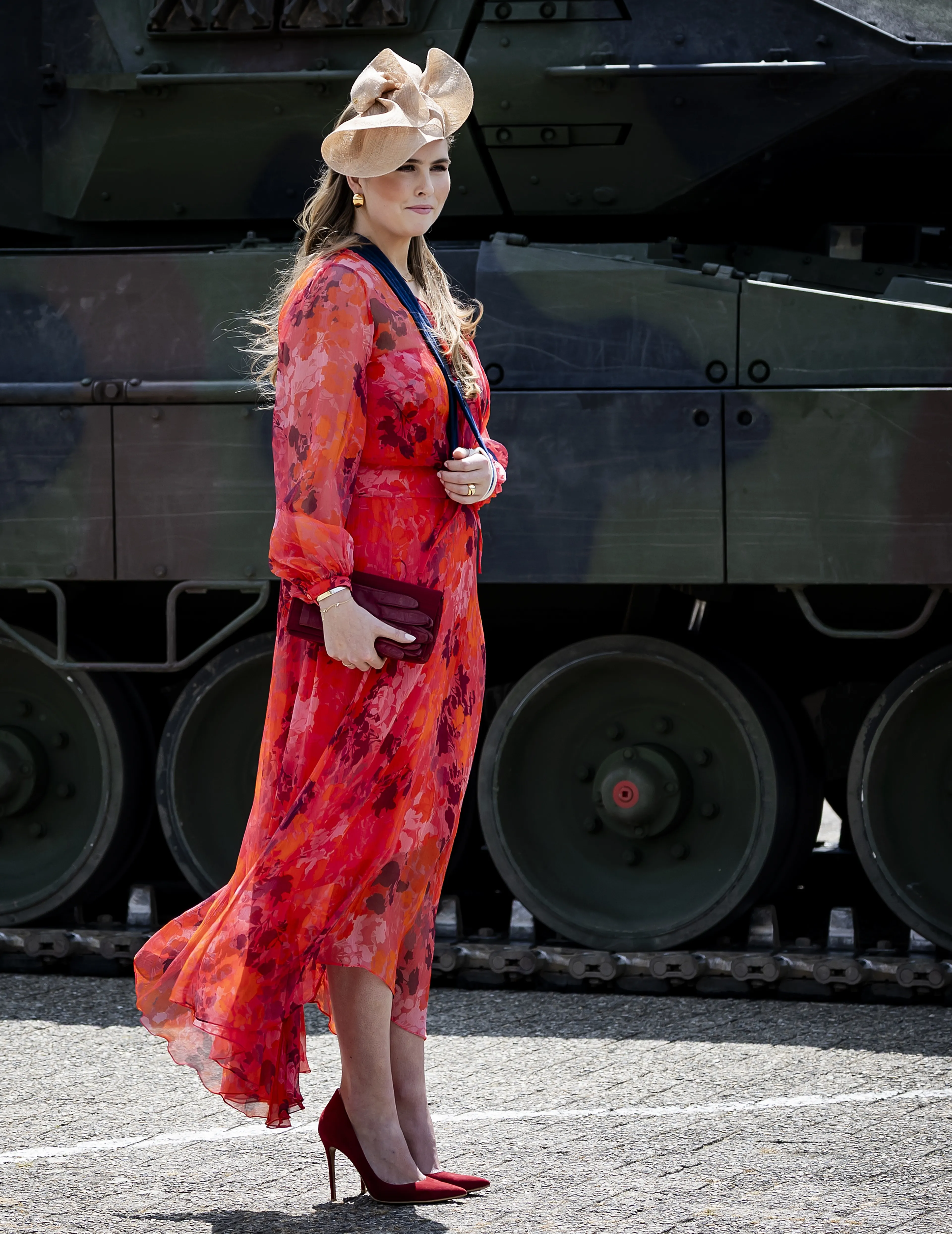 Voor deze zomerse woensdagmiddag koos prinses Amalia voor een bekende jurk. De rode midi jurk met bloemen is een exemplaar van haar moeders favoriete modemerk Natan. Als hoofddeksel droeg ze een hoed van Fabienne Delvigne, uit de garderobe van koningin Máxima. In haar handen hield ze een bijpassende clutch en handschoenen vast. Koning Willem-Alexander hulde zich vandaag in zijn uniform.