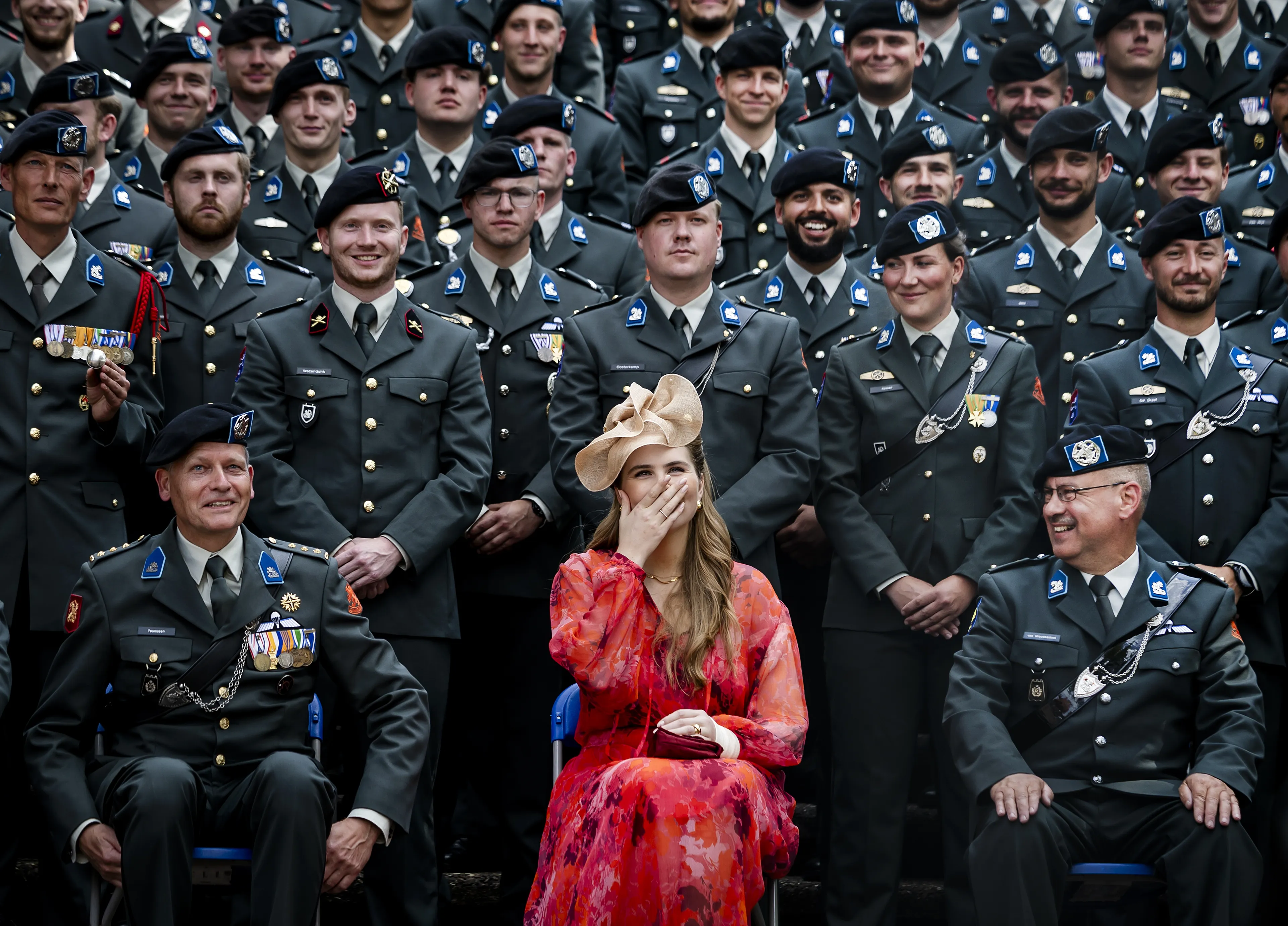 Voor vertrek poseerde het koninklijk gezelschap nog even met de leden van het regiment. Professioneel deed Amalia de sling af voor het fotomoment en legde deze opzij. De regimentsleden wilden natuurlijk óók een foto met de persoon van wie ze de naam dragen. De koning moest daarom even aan de kant wachten terwijl zijn dochter met de grote groep op de foto ging. Dat het staatshoofd voor Amalia even moest wachten, deed haar zachtjes doen lachen. De groep had nóg een verrassing voor de prinses. Iemand riep hard "Catharina", waarop de rest luid reageerde met "Amalia". Die kreet had ze duidelijk niet verwacht waardoor ze even schrok.