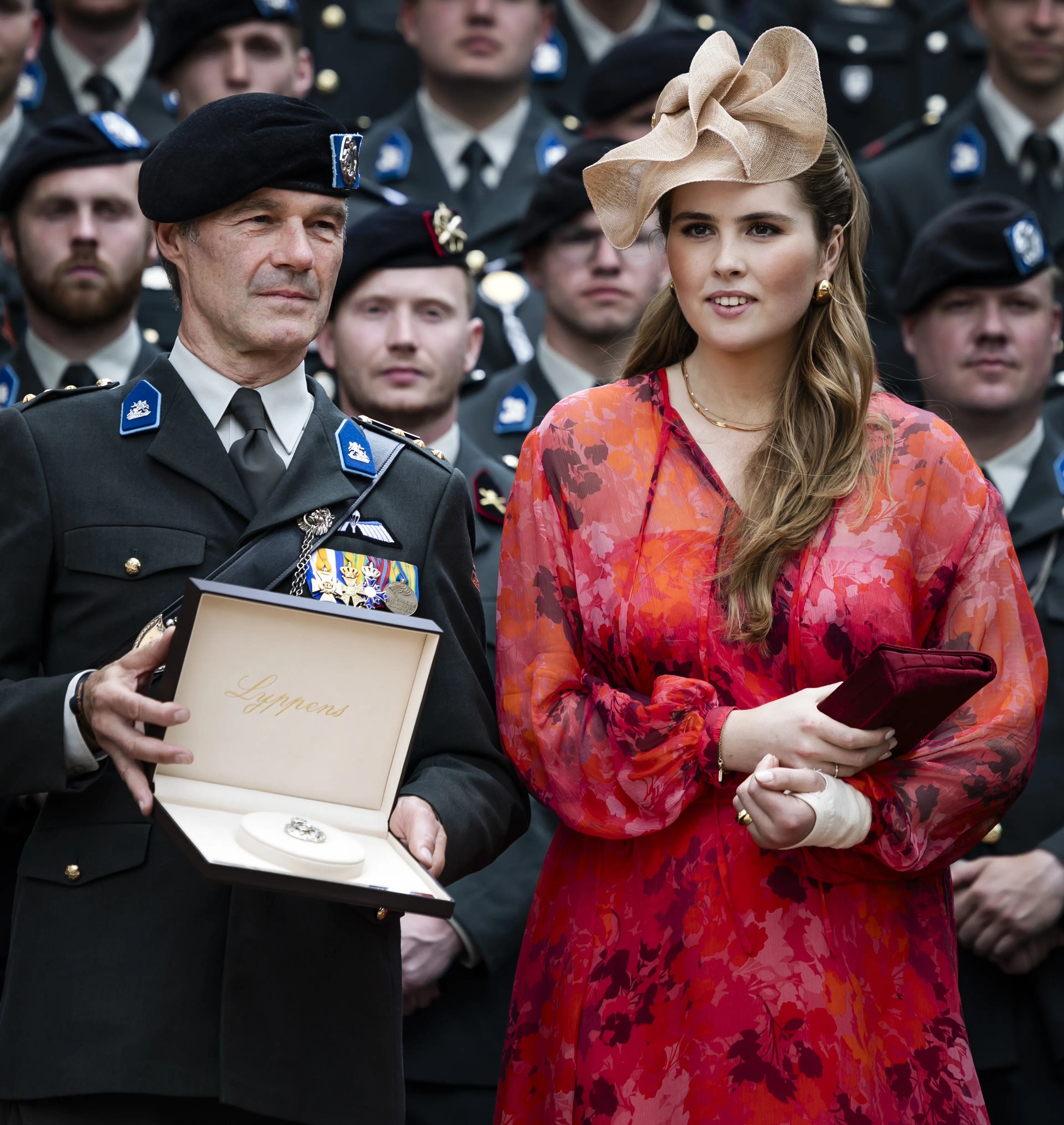 Bij aankomst op de Bernhardkazerne in Amersfoort waren alle ogen gericht op prinses Amalia. Vorige week onderging ze een operatie aan haar bovenarm na een val van haar paard. De fotosessie die in haar openbare agenda stond werd daarom uitgesteld, maar slechts een week later vergezelde ze haar vader tijdens een bijzondere ceremonie. Amalia had haar arm in een sling. Ze vertelde zelf hoe het ging: "Het doet nog pijn, maar ik ben blij dat ik er weer sta". Of ze binnenkort weer op haar paard stapt? "Helaas nog niet."