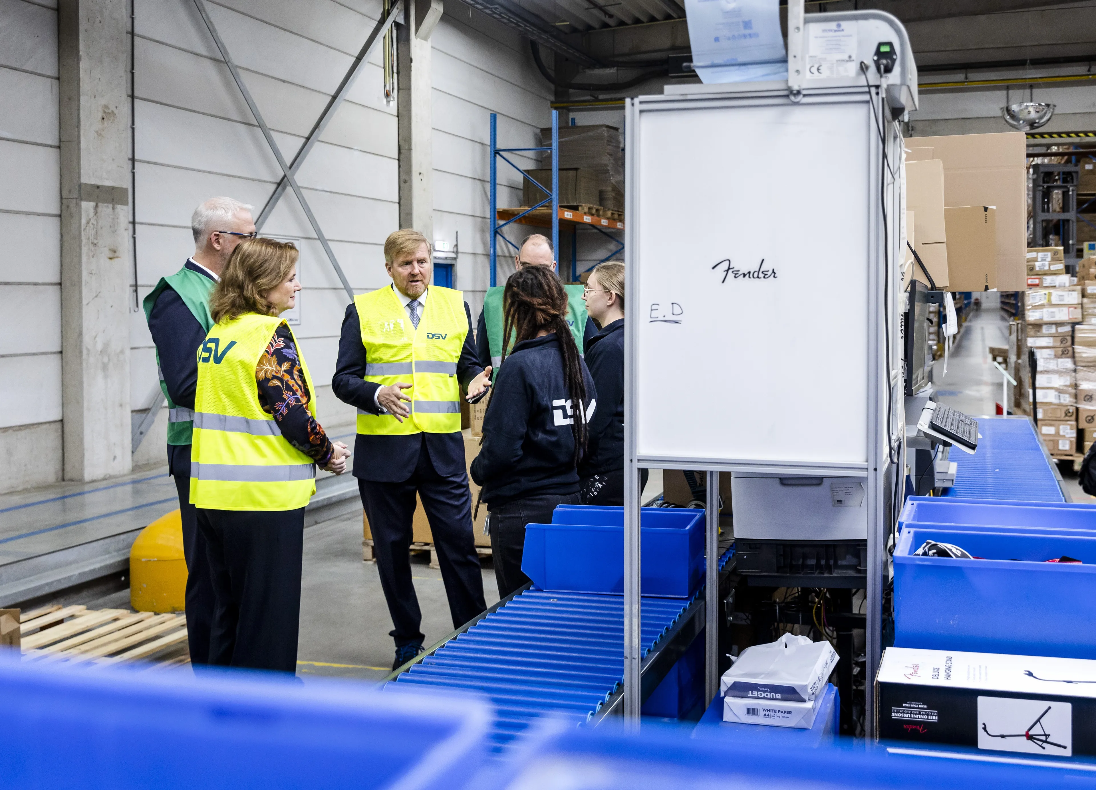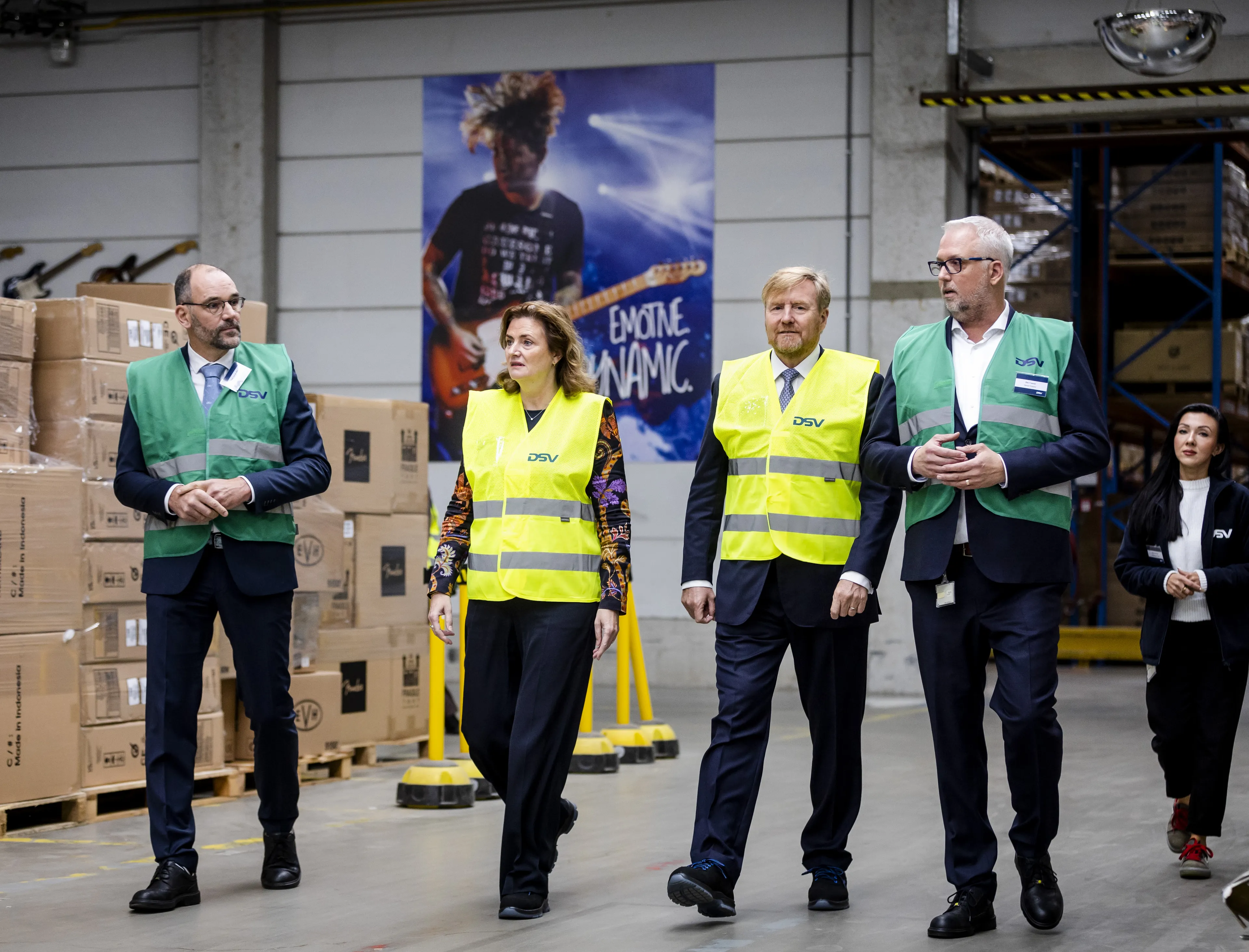 Bij de regenachtige aankomst bij DSV in Moerdijk werd de koning welkom geheten door Van Gennip en door de vicepresident en de senior director van DSV Solutions. Dit bedrijf voor transport- en logistieke dienstverlening heeft veel arbeidsmigranten in dienst. Na de begroeting kreeg de koning een rondleiding langs verschillende werkplekken in de loods en het magazijn.