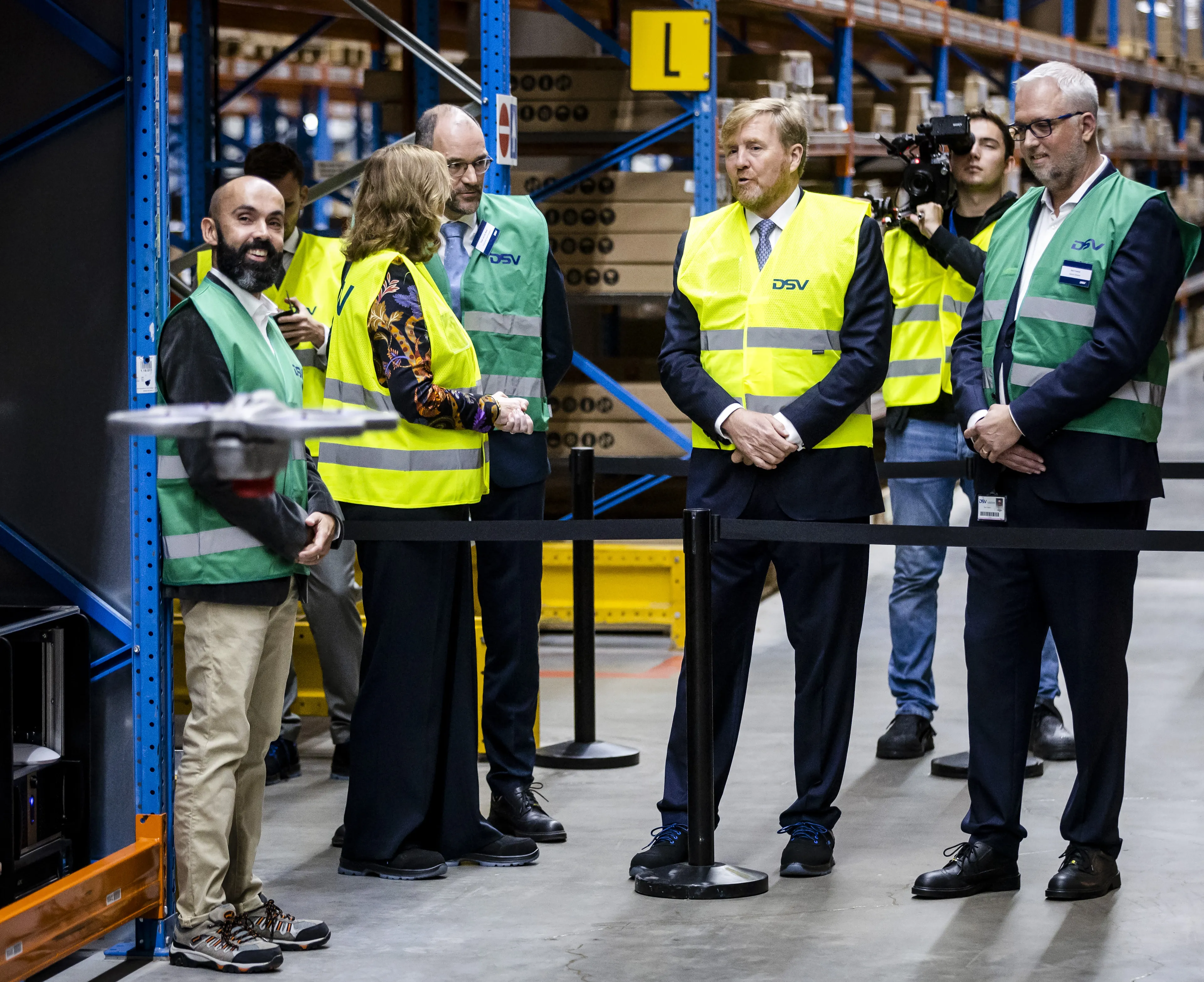 Ook kreeg Willem-Alexander een presentatie van de drones die de aanwezige voorraad in beeld brengen. Voorheen gebeurde dit nog handmatig. Het bezoek werd afgesloten met een gesprek over DSV als werkgever en problemen die spelen bij de huisvesting van de arbeidsmigranten.