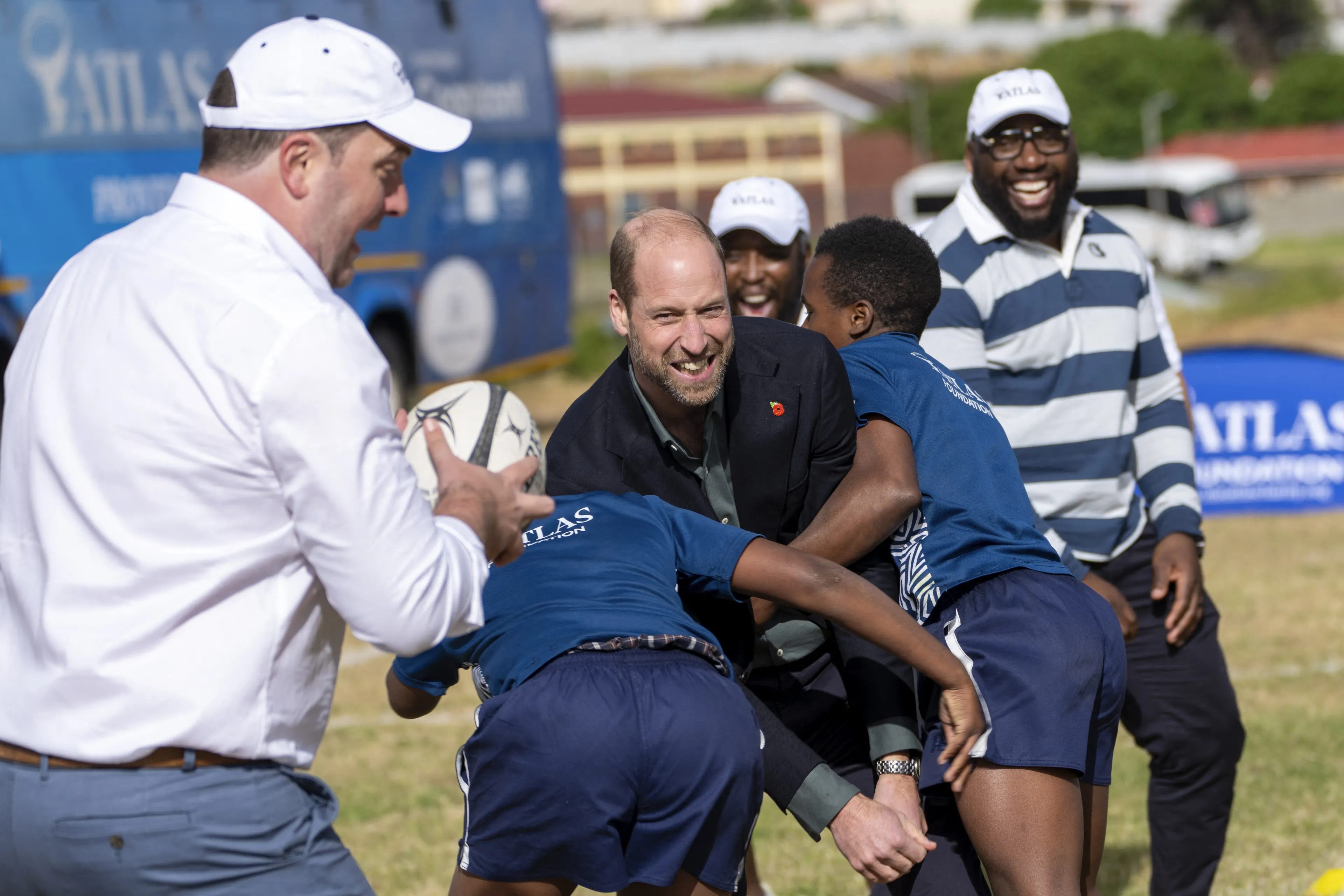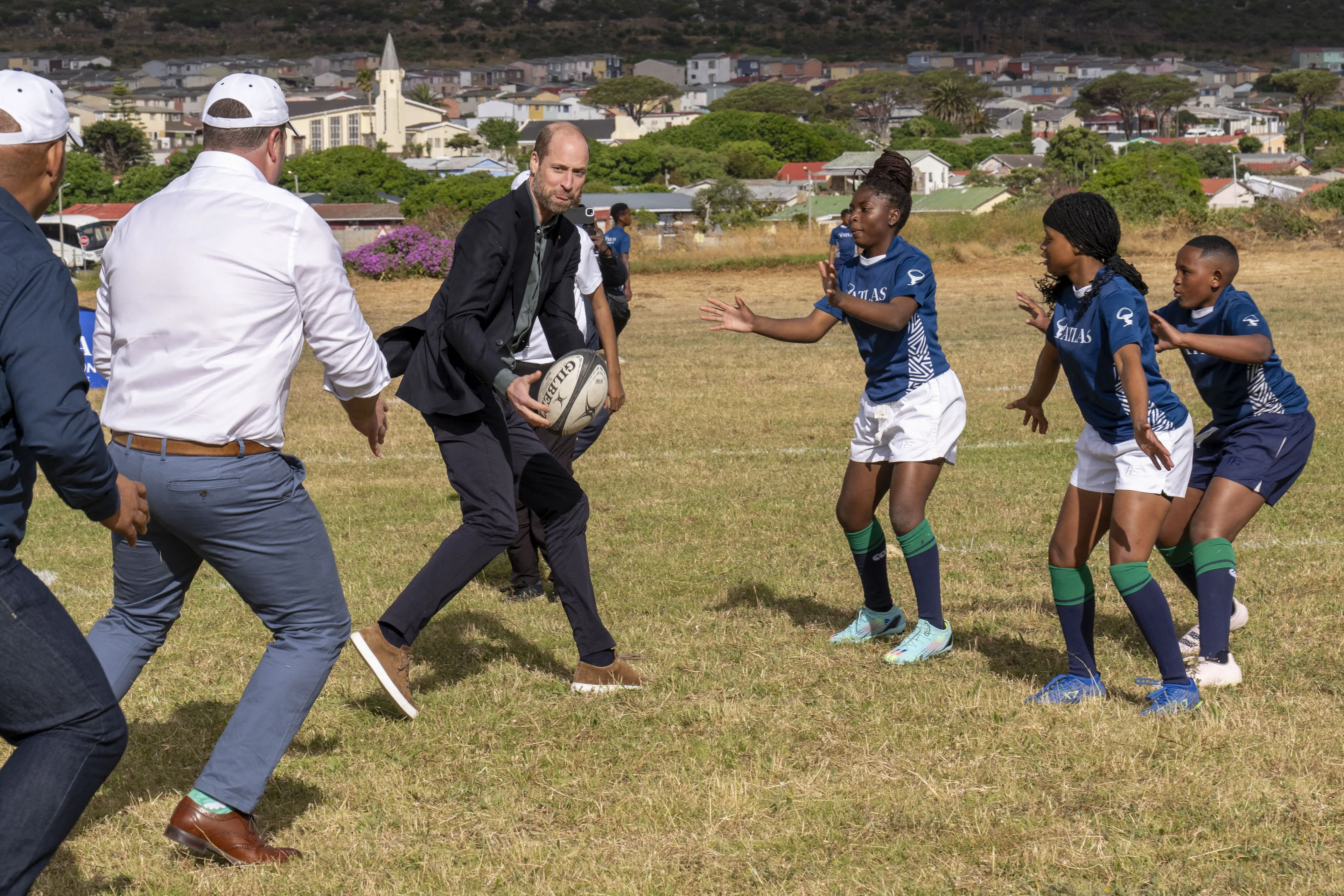 Terug naar Kaapstad, waar prins William zich op zijn eerste dag kostelijk lijkt te vermaken. De prins bezocht maandag een middelbare school waar hij meedeed aan een rugbytraining. Een van zijn favoriete sporten. Daar werd hij niet met zijden handschoenen aangeraakt; de leerlingen waren er juist op uit om de prins flink aan te pakken. "Laten we de prins tackelen", werd er gezegd. Ook voormalig rugbyspeler van het Zuid-Afrikaanse nationale team Joel Stransky pakte William beet door zijn jasje te grijpen. "Het gebeurde per ongeluk", verklaarde Stransky later tegen een royaltyverslaggever. "Ik dacht daarna 'oh nee, ik heb een prins gegrepen'. Maar hij is een aardige vent, heel bescheiden."