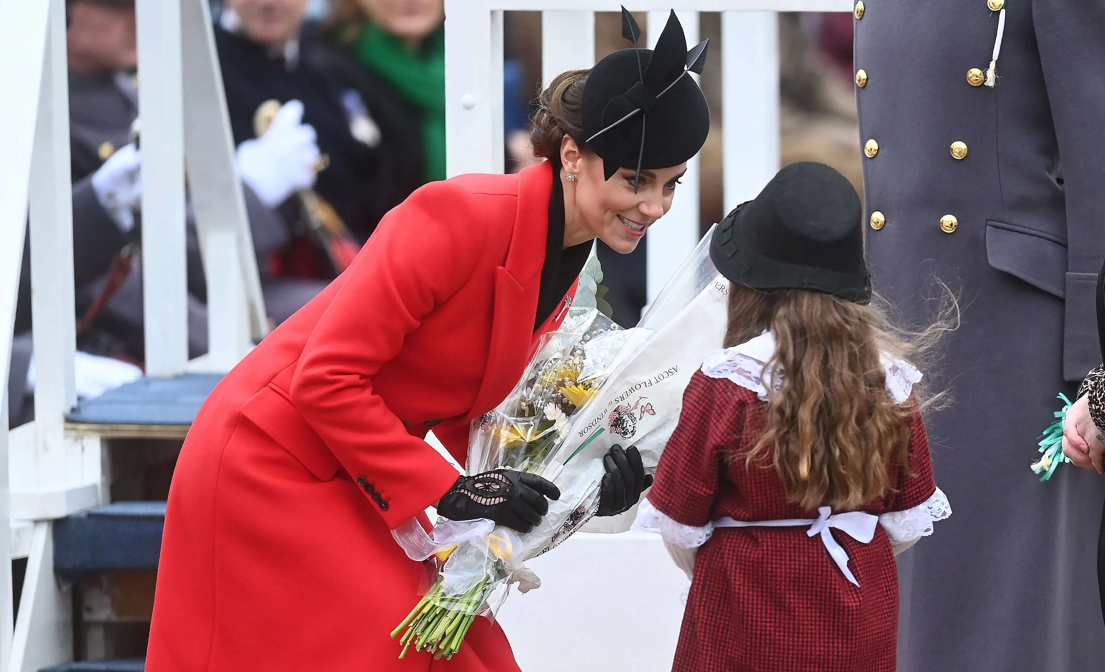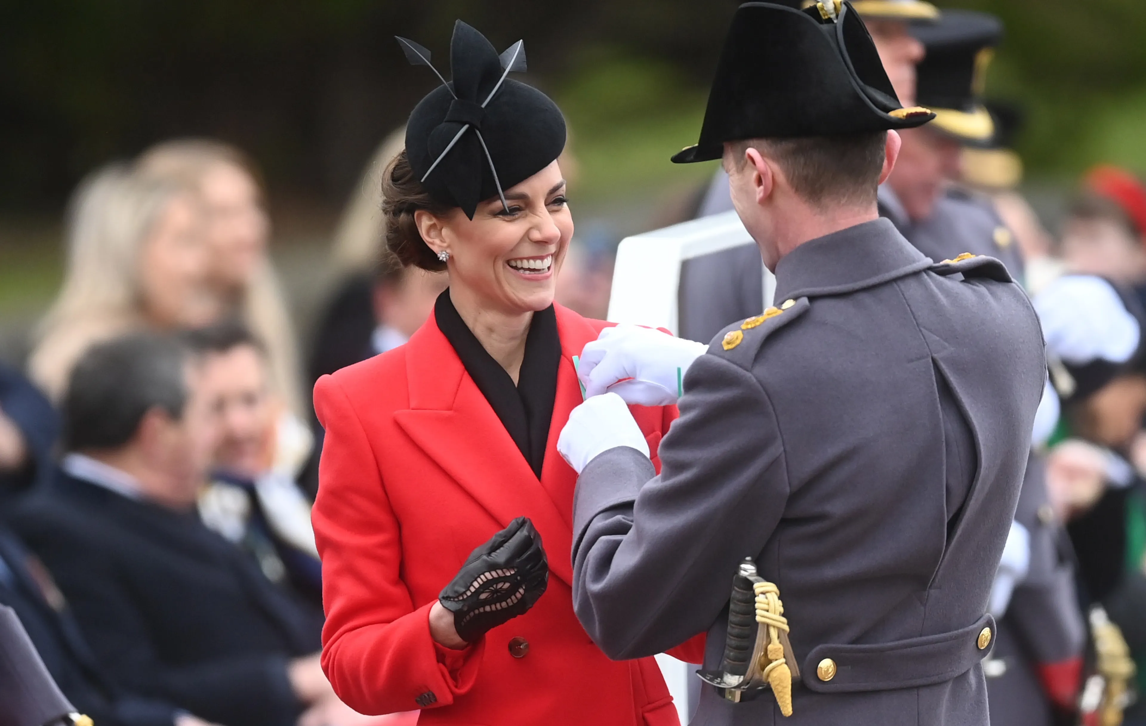 Het was het eerste bezoek van het koppel aan het bataljon sinds William in december werd benoemd tot kolonel van de Welsh Guards. Die titel nam hij toen over van zijn vader, koning Charles. In die rol poseerden de prins en prinses van Wales ook voor een foto met het bataljon van de Welsh Guards. Daarbij was Catherine met haar rode jas een opvallende verschijning tussen alle grijze jassen van de militairen.