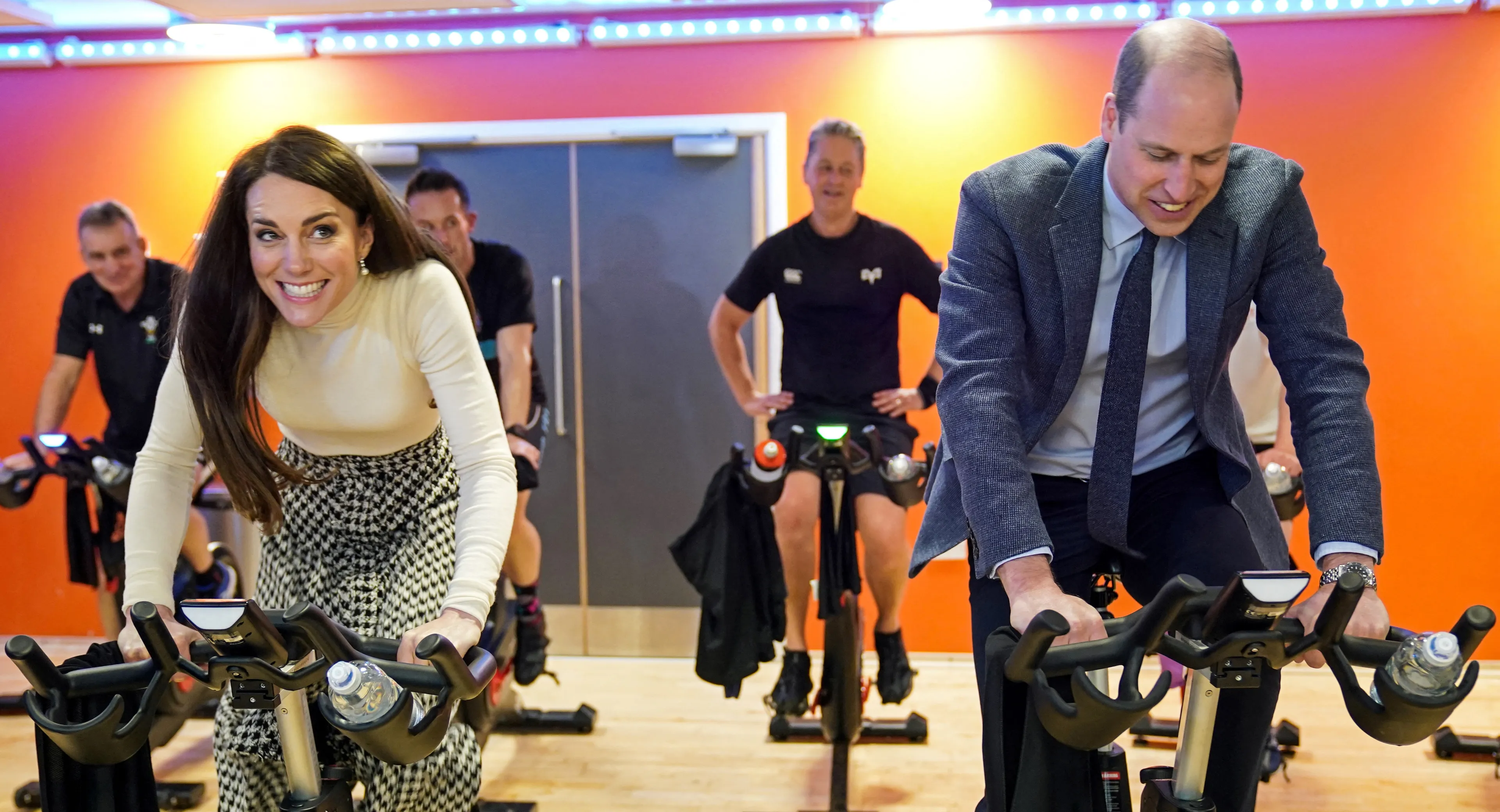 Prins William en zijn vrouw prinses Catherine hebben het dinsdag tegen elkaar opgenomen op spinningfietsen. Tijdens een bezoek aan een sportschool in de Welshe stad Port Talbot werd het echtpaar uitgedaagd tot een wedstrijdje en dat ging er hard aan toe!