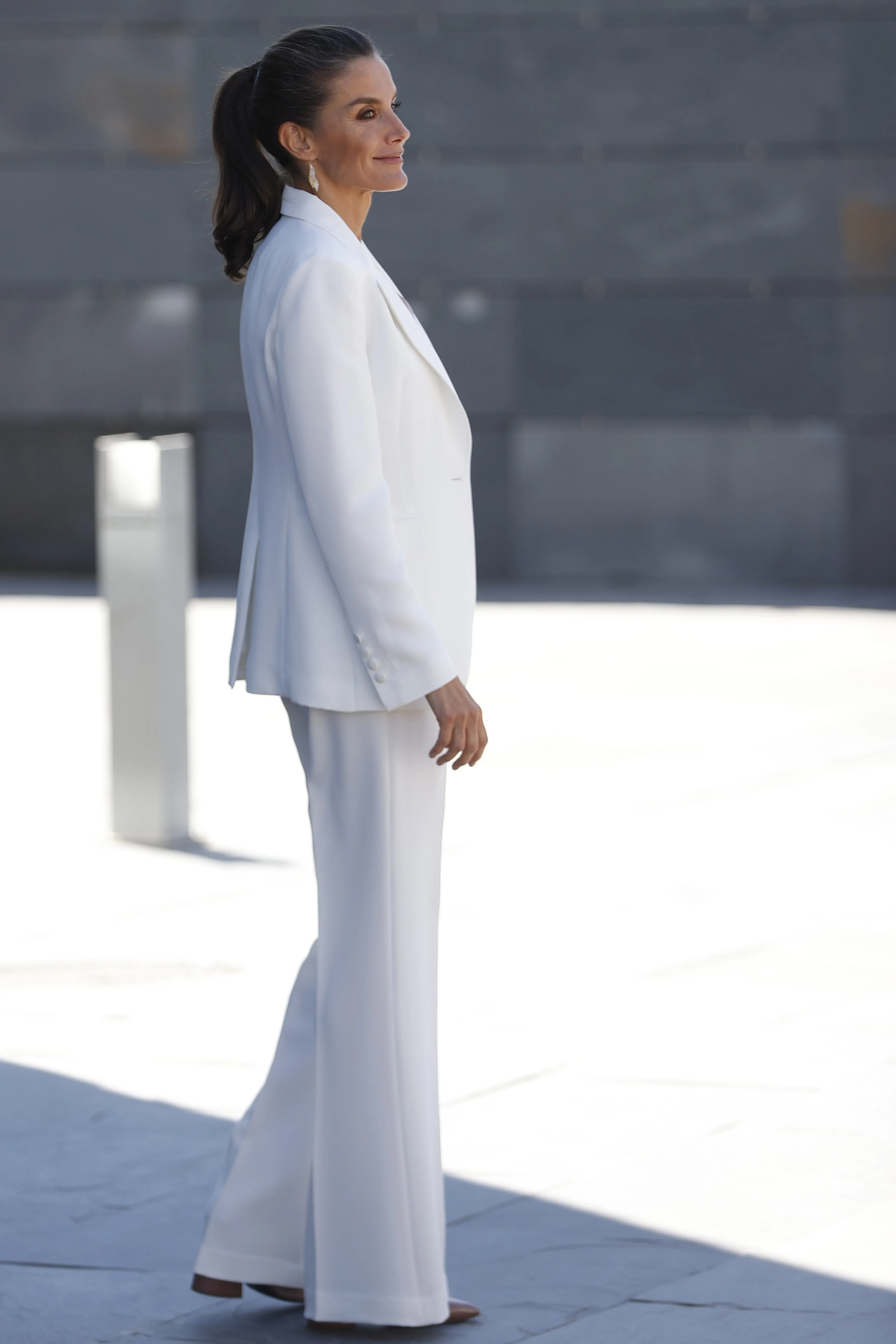 De Spaanse koningin Letizia is niet vies van een fel kleurtje hier en daar (zo is ze dol op Barbieroze). Maar ook een wit kostuum staat haar prachtig. Zo draagt ze pakken met een rechte pasvorm en wijd uitlopende pijpen.