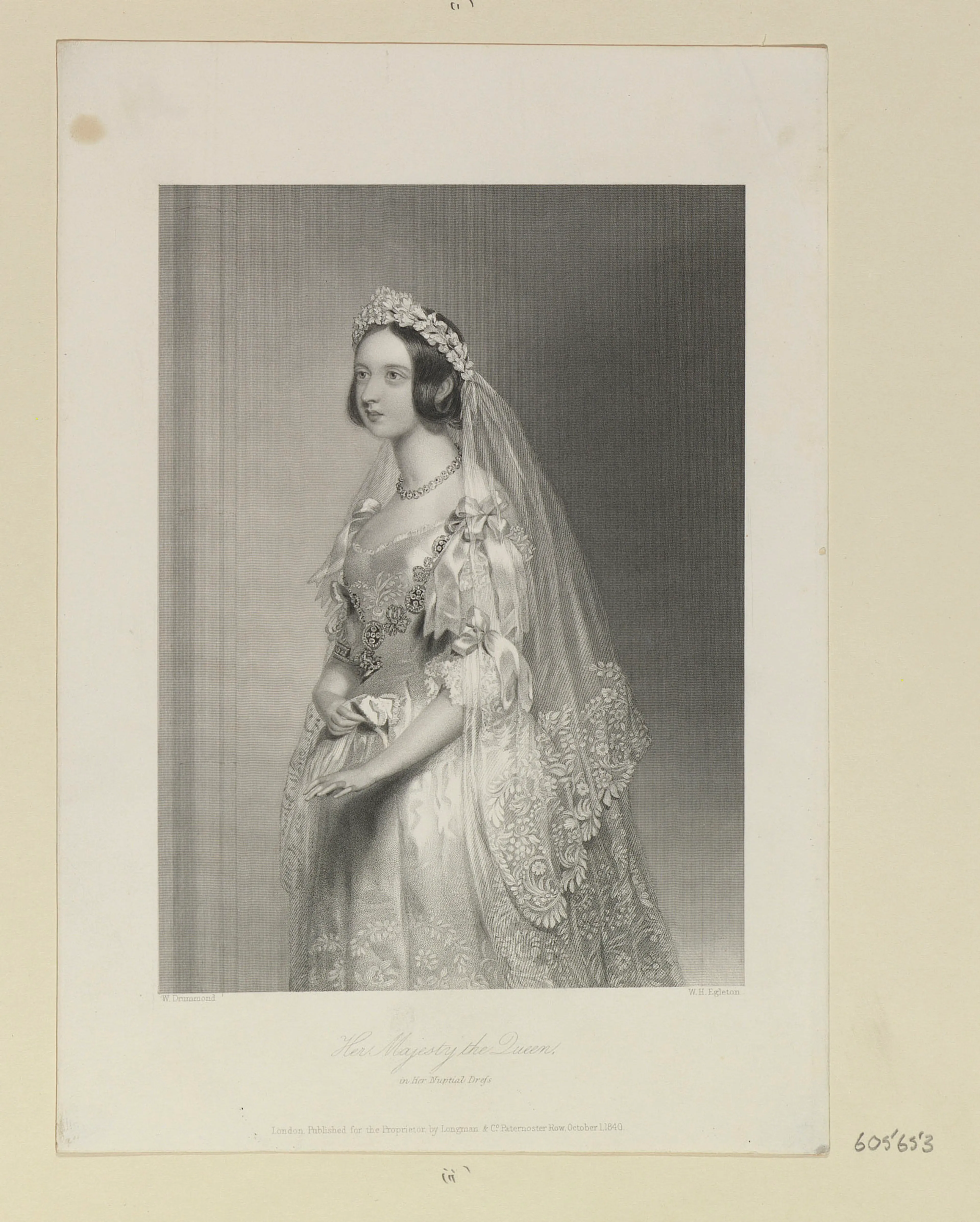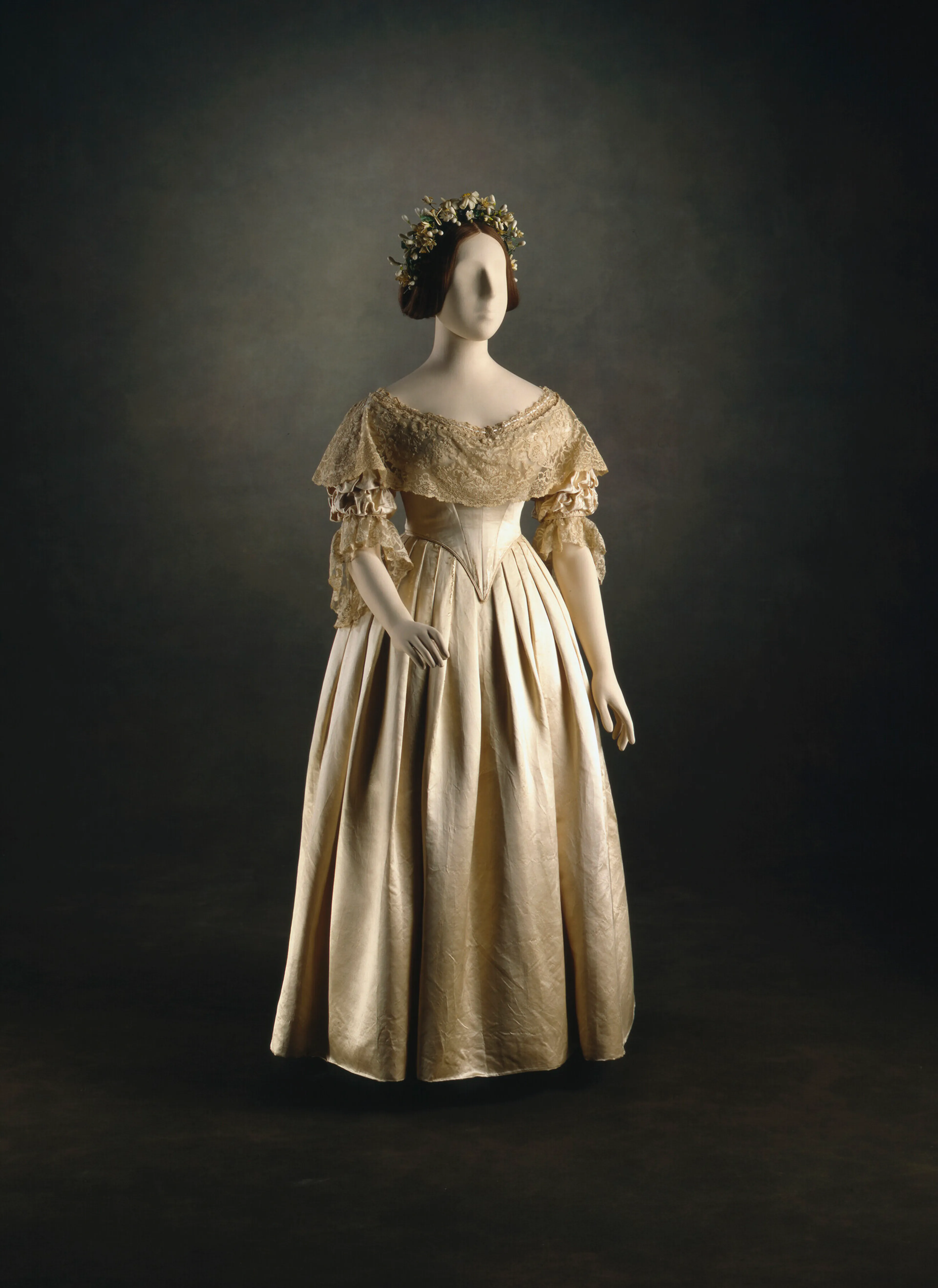 Koningin Victoria koos voor haar huwelijk met prins Albert op 10 februari 1840 voor een jurk in de tint wit. Het ontwerp is gemaakt van crèmekleurig zijden satijn en bestaat uit een aantal elementen. Het heeft een puntig lijfje met zijde gevoerde baleinen, de gerimpelde mouwen reiken tot aan de elleboog. De hals is diep uitgesneden waaraan kanten volants zijn bevestigd, net als op de mouwen. Voor de meeste ontwerpen werd Brussels kant gebruikt. Op verzoek van koningin Victoria werd er Brits Honiton-kant vervaardigd om de kantindustrie daar nieuw leven in te blazen.