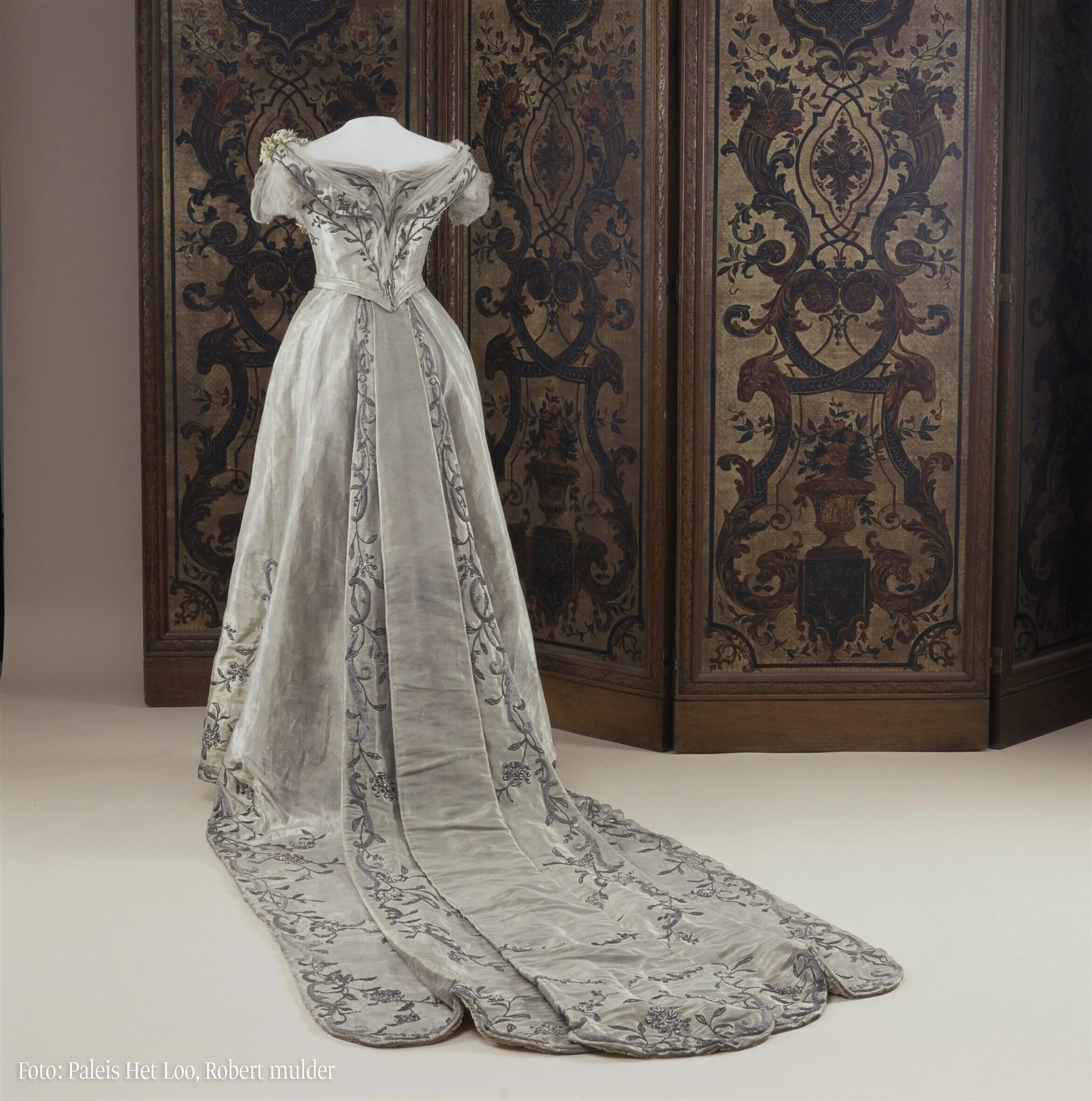 De trend van witte bruidsjurken waaide niet direct over naar Nederland. Voor het huwelijk van koningin Wilhelmina met prins Hendrik op 7 februari 1901 koos de bruid namelijk niet voor wit, maar voor een zilverkleur. De jurk is gemaakt van zilverlamé zijde en heeft borduursels met gouddraad, zilverdraad en glasparels. Een detail dat bij beide koninginnen op de jurk te zien is, is de oranjebloesem. Die symboliek is verweven door de historische verbintenis tussen beide koningshuizen.