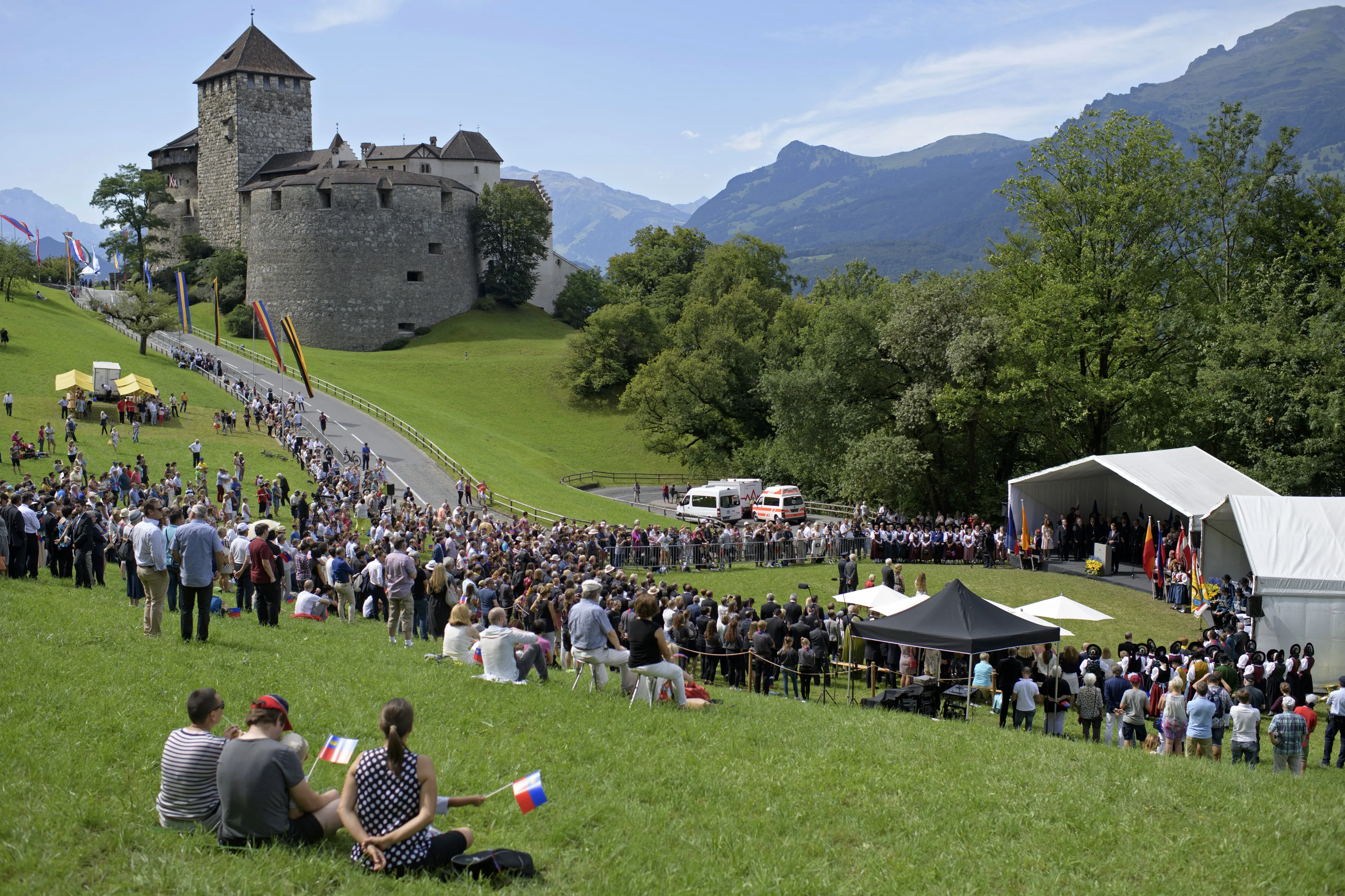 Tijdens de nationale feestdag op 15 augustus komen veel mensen naar Schloss Vaduz. In de tuinen rondom het kasteel wordt feest gevierd, zoals je op de onderstaande foto kunt zien.
