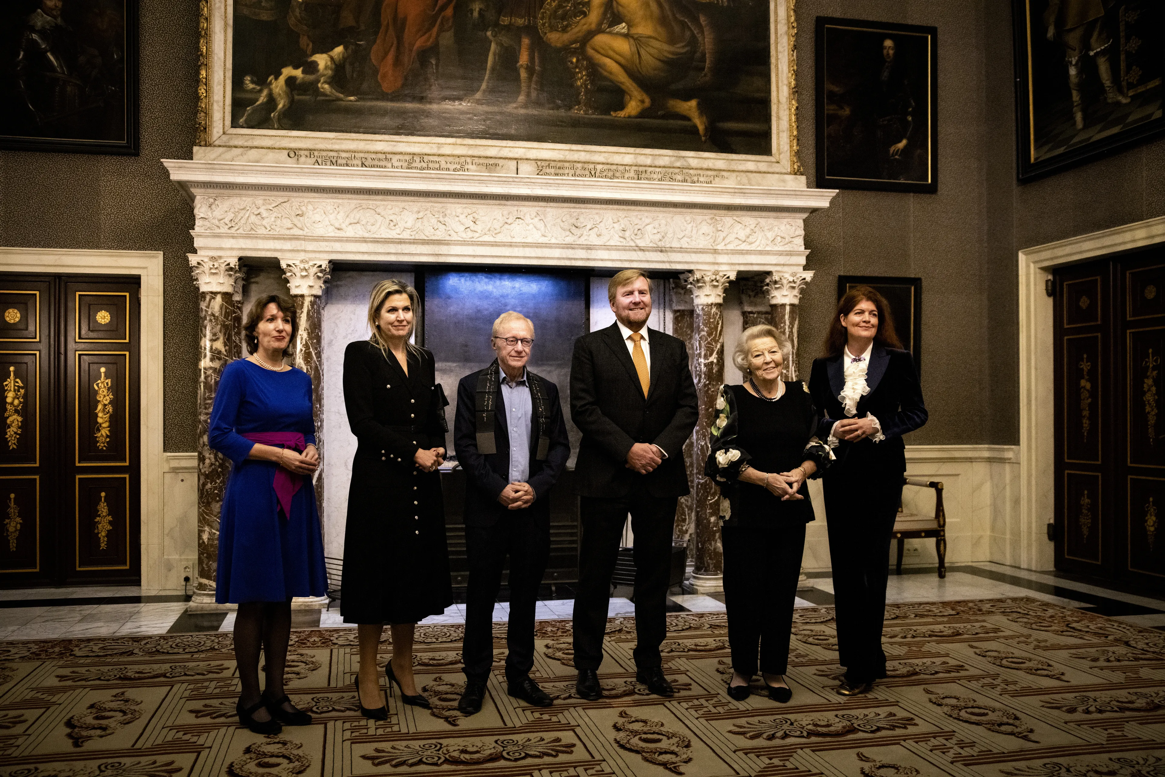 Koning Willem-Alexander reikte dinsdagmiddag de Erasmusprijs uit aan de Israëlische schrijver David Grossman. De prijs wordt elk jaar uitgereikt aan iemand die een belangrijke bijdrage heeft geleverd aan Europese tradities op het gebied van bijvoorbeeld geschiedenis en literatuur. De koningin kwam iets later maar was nog wel op tijd voor het maken van de groepsfoto.