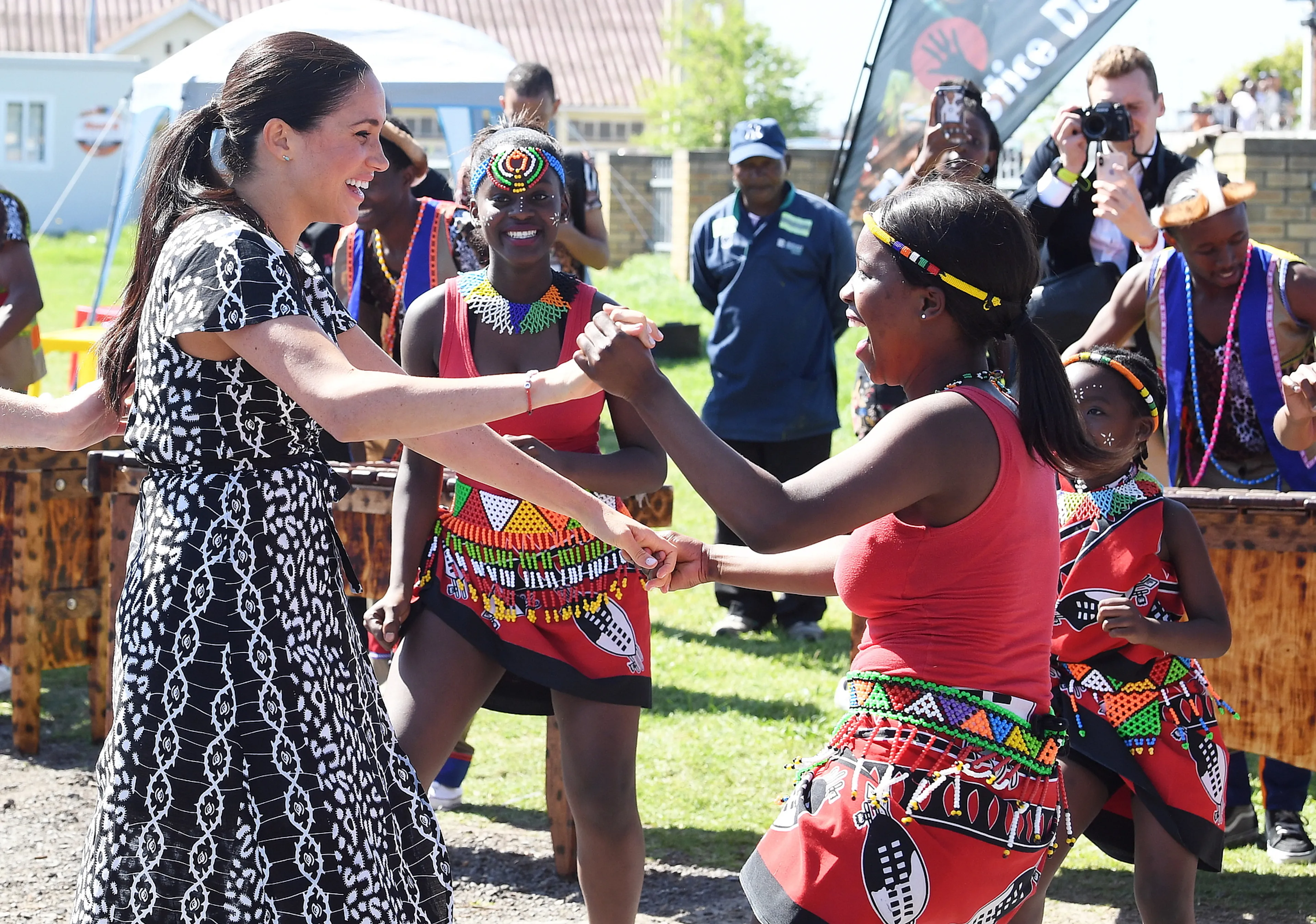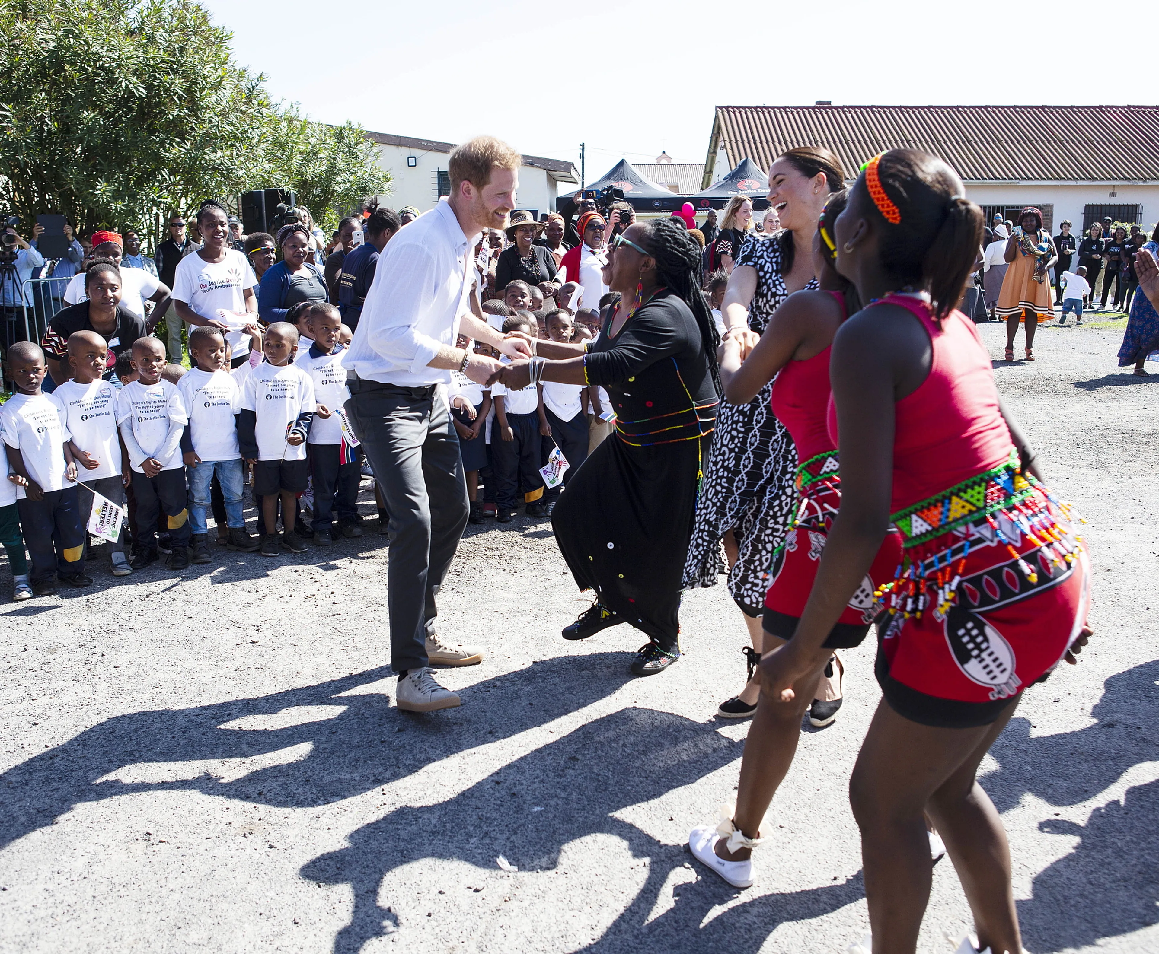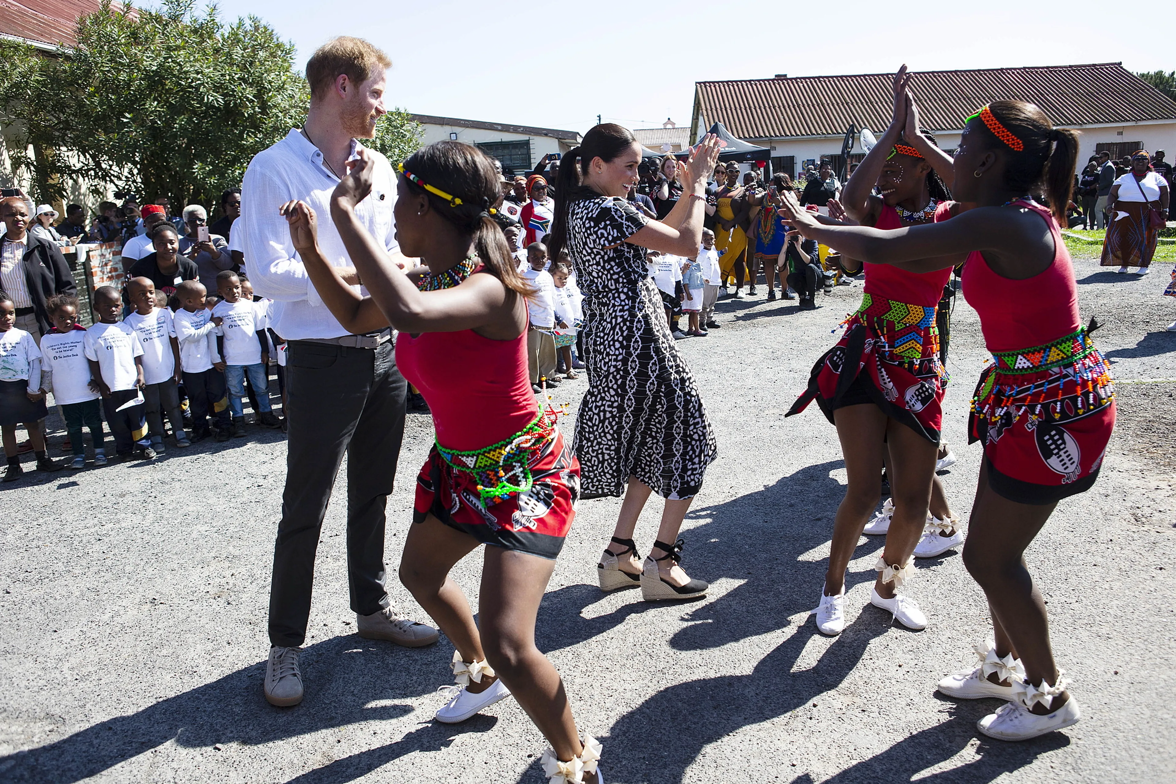 Twee kleine jongetjes van de sloppenwijk kregen Harry en Meghan aan het dansen. De kereltjes lieten de Sussexes ook zien hoe de jeugd elkaar begroet in het township. Zij deden voor hoe ze elkaar altijd eerst een dubbele high-five geven en daarna een boks. Harry daagde vervolgens de jongens uit om hun danspasjes te laten zien en werd meteen getrakteerd op een Zuid-Afrikaans ritmisch dansje.