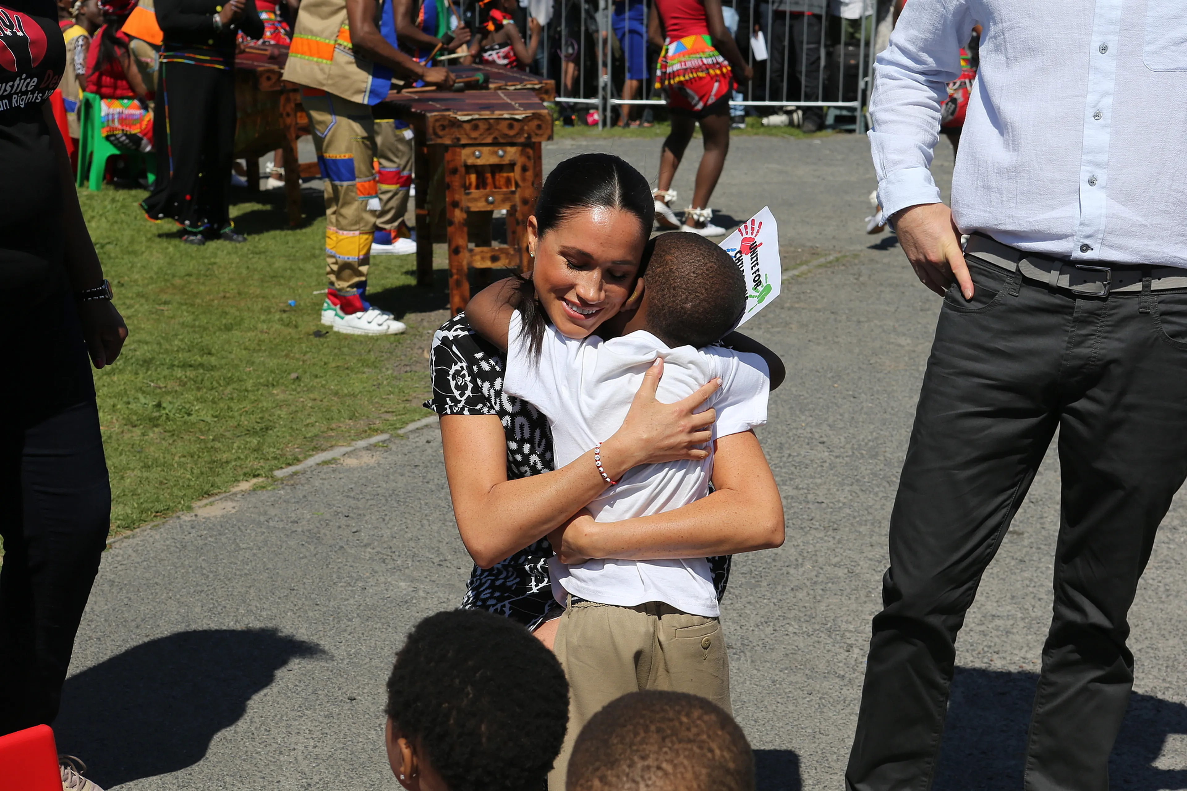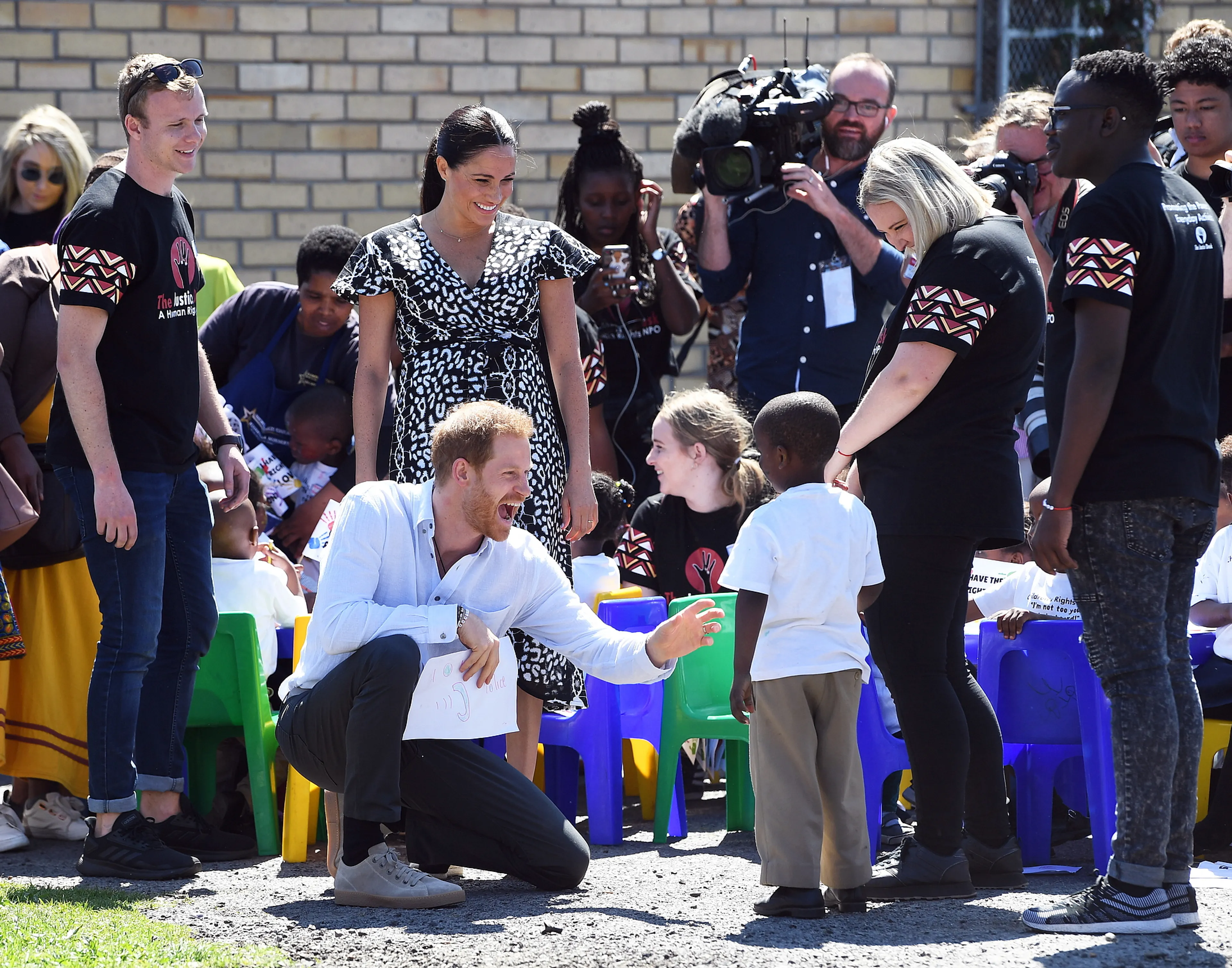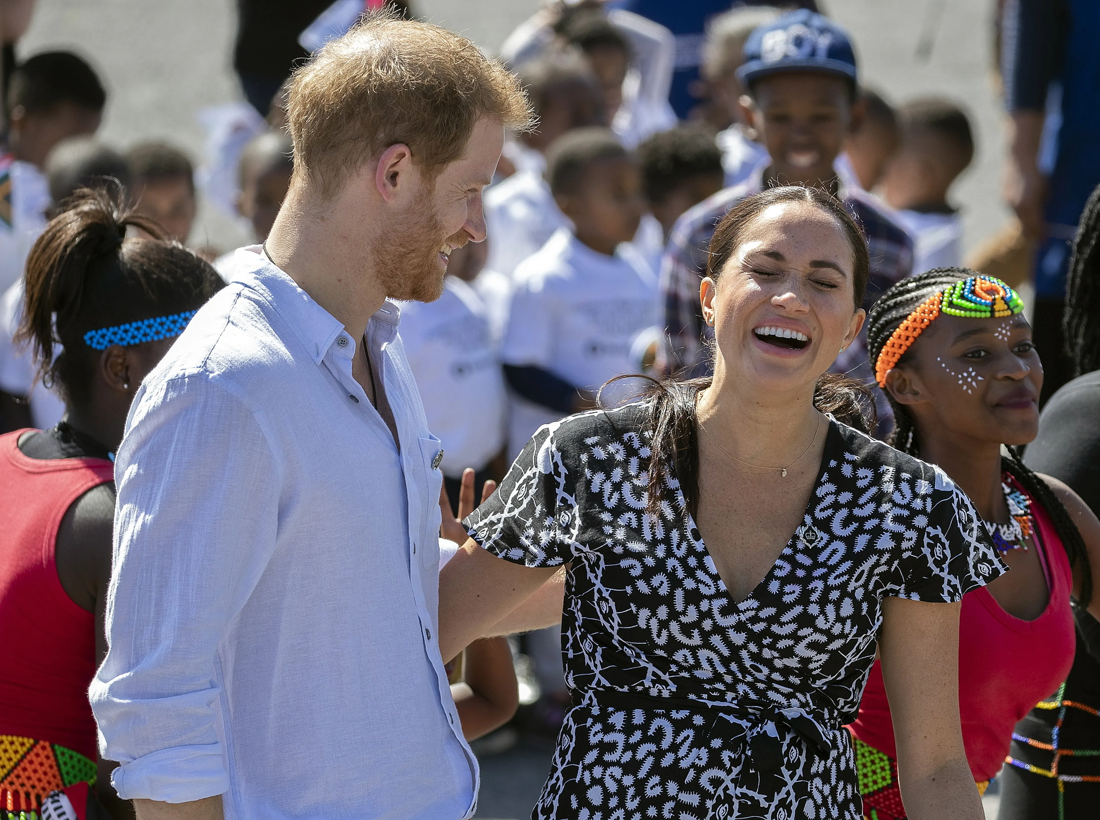 Twee kleine jongetjes van de sloppenwijk kregen Harry en Meghan aan het dansen. De kereltjes lieten de Sussexes ook zien hoe de jeugd elkaar begroet in het township. Zij deden voor hoe ze elkaar altijd eerst een dubbele high-five geven en daarna een boks. Harry daagde vervolgens de jongens uit om hun danspasjes te laten zien en werd meteen getrakteerd op een Zuid-Afrikaans ritmisch dansje.