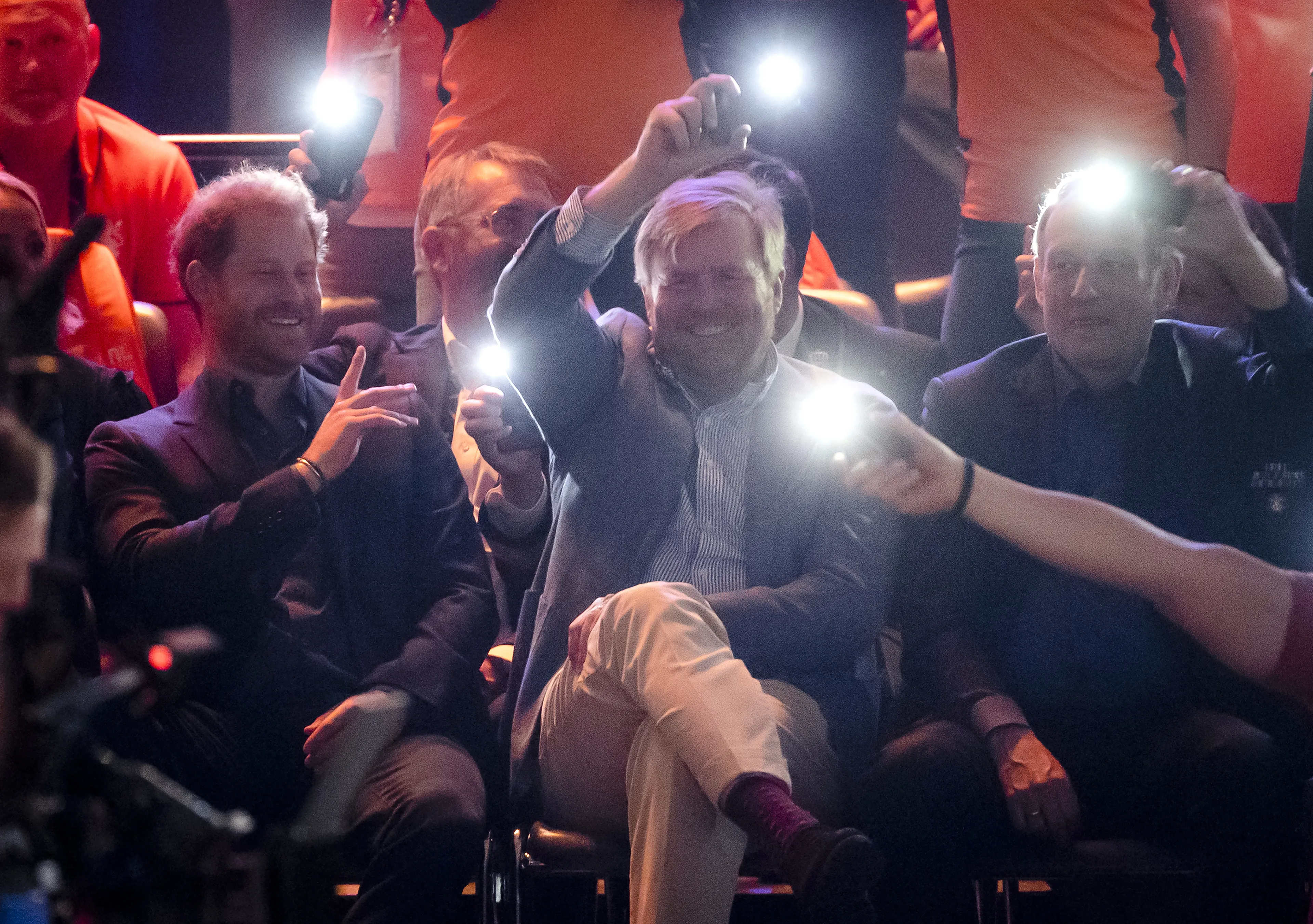 Ook tijdens de publieksopwarming en het optreden van DI-RECT zaten de mannen niet stil. Prins Harry keek even de kat uit de boom, maar zag al snel dat Willem-Alexander, prinses Margriet en prins Pieter-Christiaan vrolijk meeklapten, -zongen en -bewogen. De prins kon daarom niet achterblijven. Tijdens de rust nam hij ook even de tijd om Nederlandse teamleden een knuffel te geven.