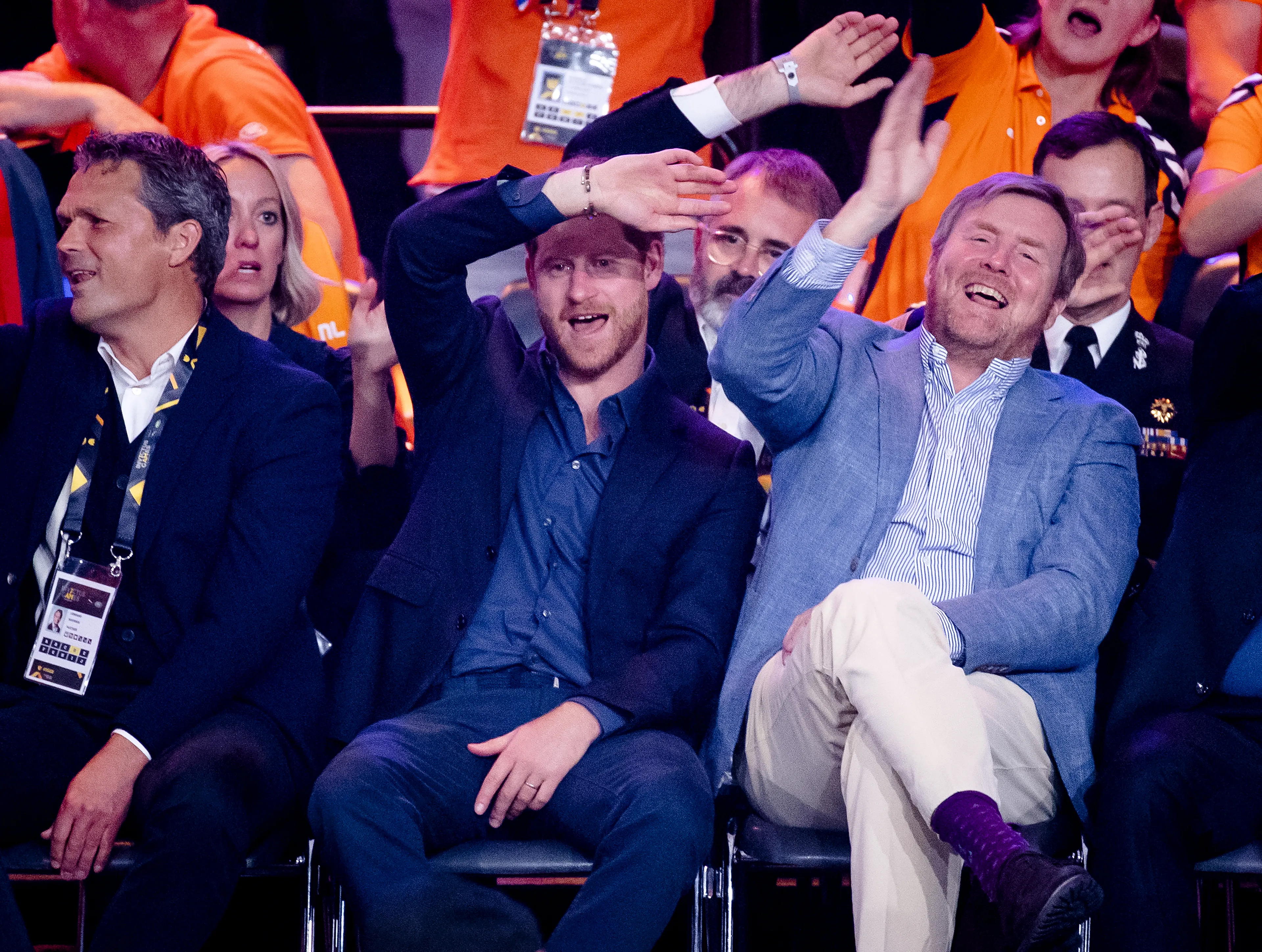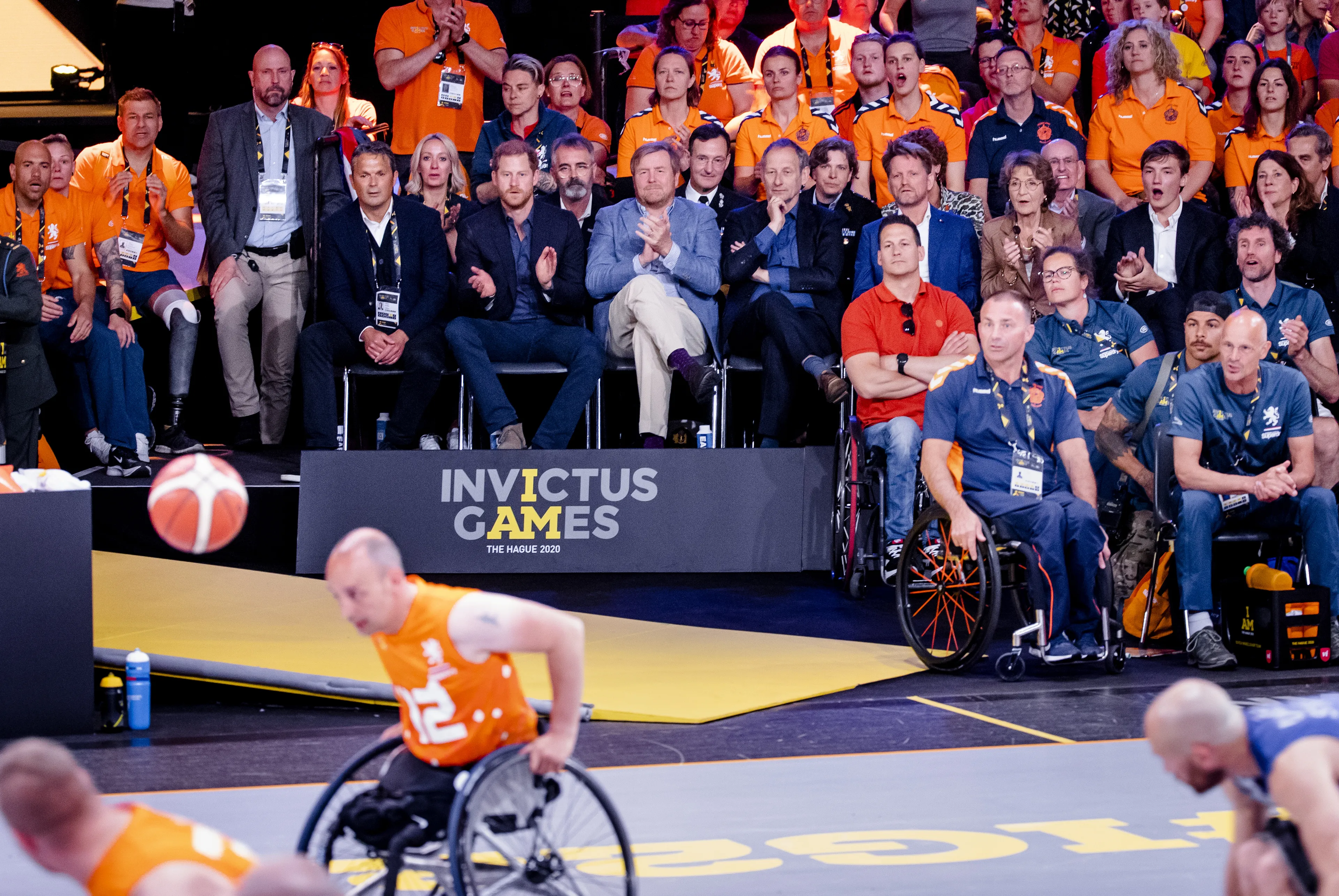 Prins Harry en koning Willem-Alexander gingen vrijdag op de laatste dag van de Invictus Games samen naar de finale van het rolstoelbasketbal. De twee babbelden wat af, maar waren ook vriendschappelijke tegenstanders: de strijd ging immers om Nederland tegen de Verenigde Staten.