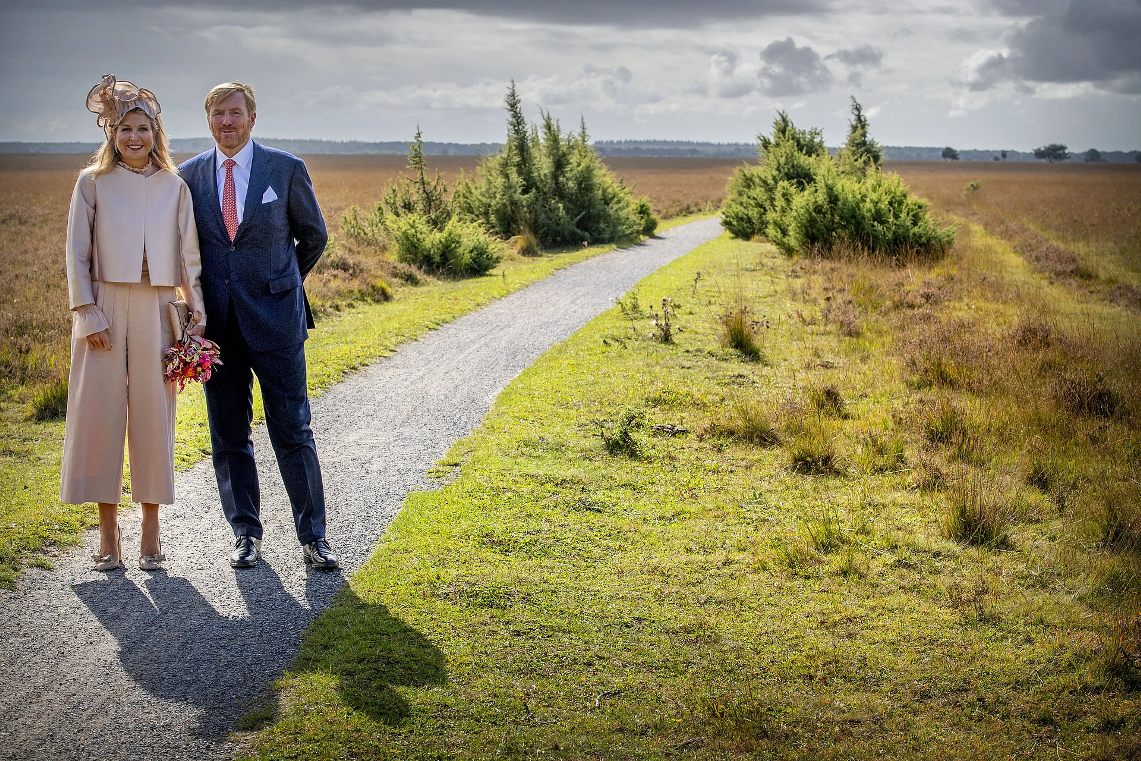 Willem-Alexander en Máxima zijn aangekomen in Westerveld. Daar kregen zij op het Dwingelderveld, het grootste natte heidegebied van West-Europa, van vrijwilligers van Natuurmonumenten uitleg over natuurbehoud en het in stand houden van de biodiversiteit in het gebied. Op de achtergrond was nog de schaapkudde zichtbaar die zorgt dat de heide vrij blijft van ongewenste grasgroei. Het bezoek aan de heide werd direct aangegrepen om een serie foto's van de koning en koningin te maken.