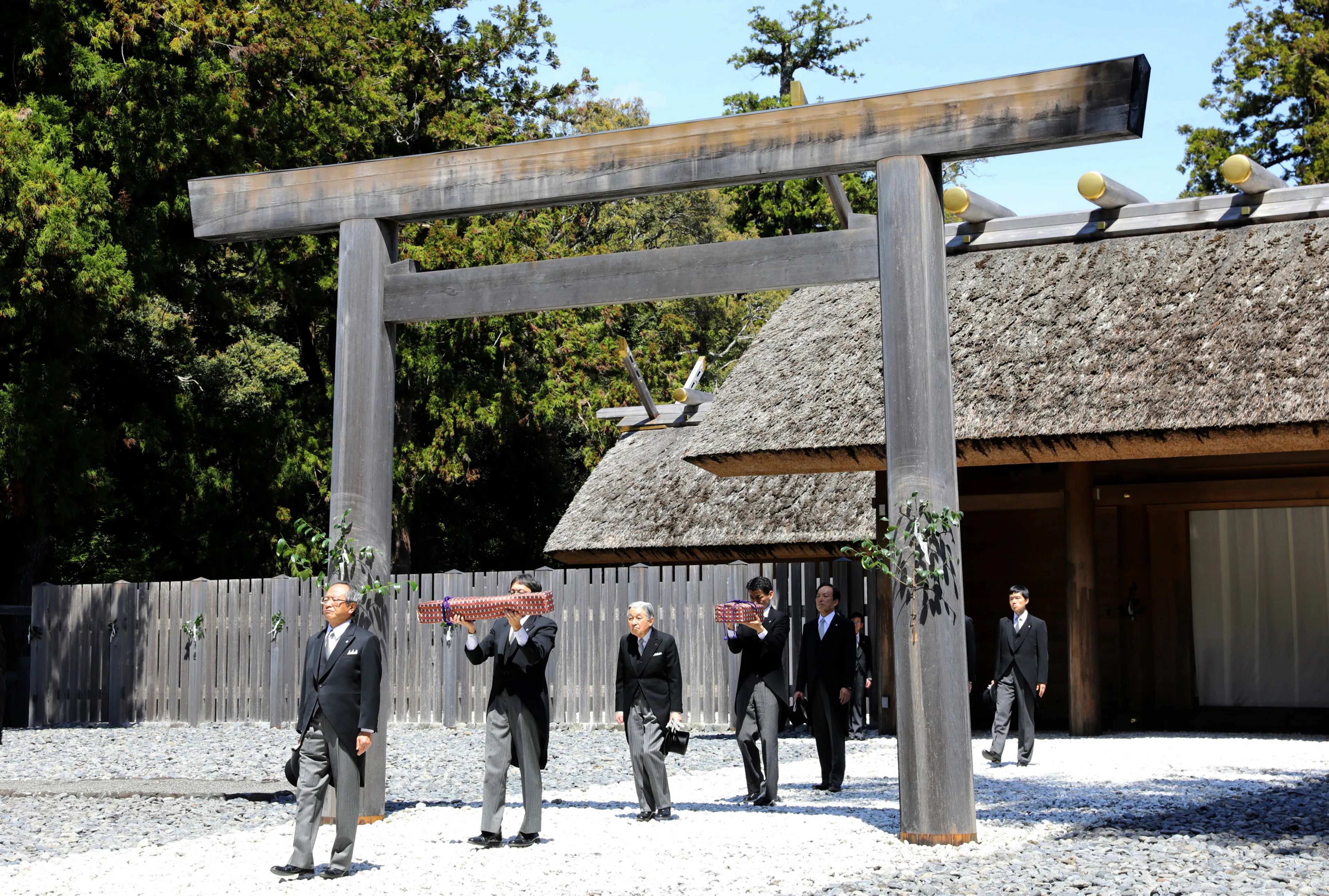 Het Japanse keizerspaar heeft donderdag in Ise een bezoek gebracht aan het belangrijke Shinto-heiligdom Ise Jingu waar ze aan de godin van de zon, Amaterasu, de aanstaande troonswisseling aankondigden. Amaterasu is volgens de legende de grondlegger van het keizershuis.