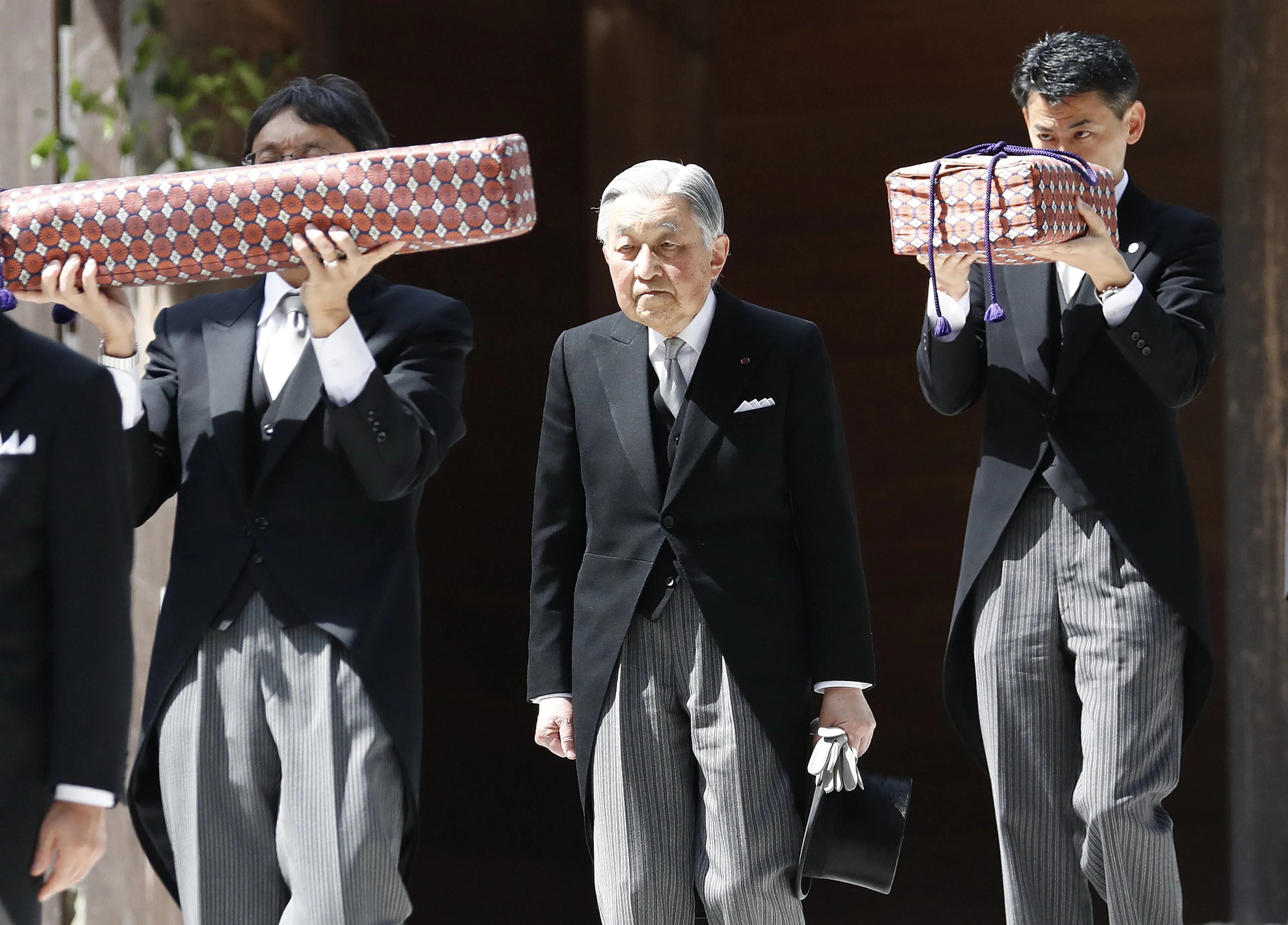 Keizer Akihito, die op 30 april aftreedt, had voor dit speciale bezoek volgens eeuwenoud gebruik twee van de drie keizerlijke regalia meegenomen: het heilige zwaard en het keizerlijk juweel. Die werden door twee paleisfunctionarissen meegedragen.