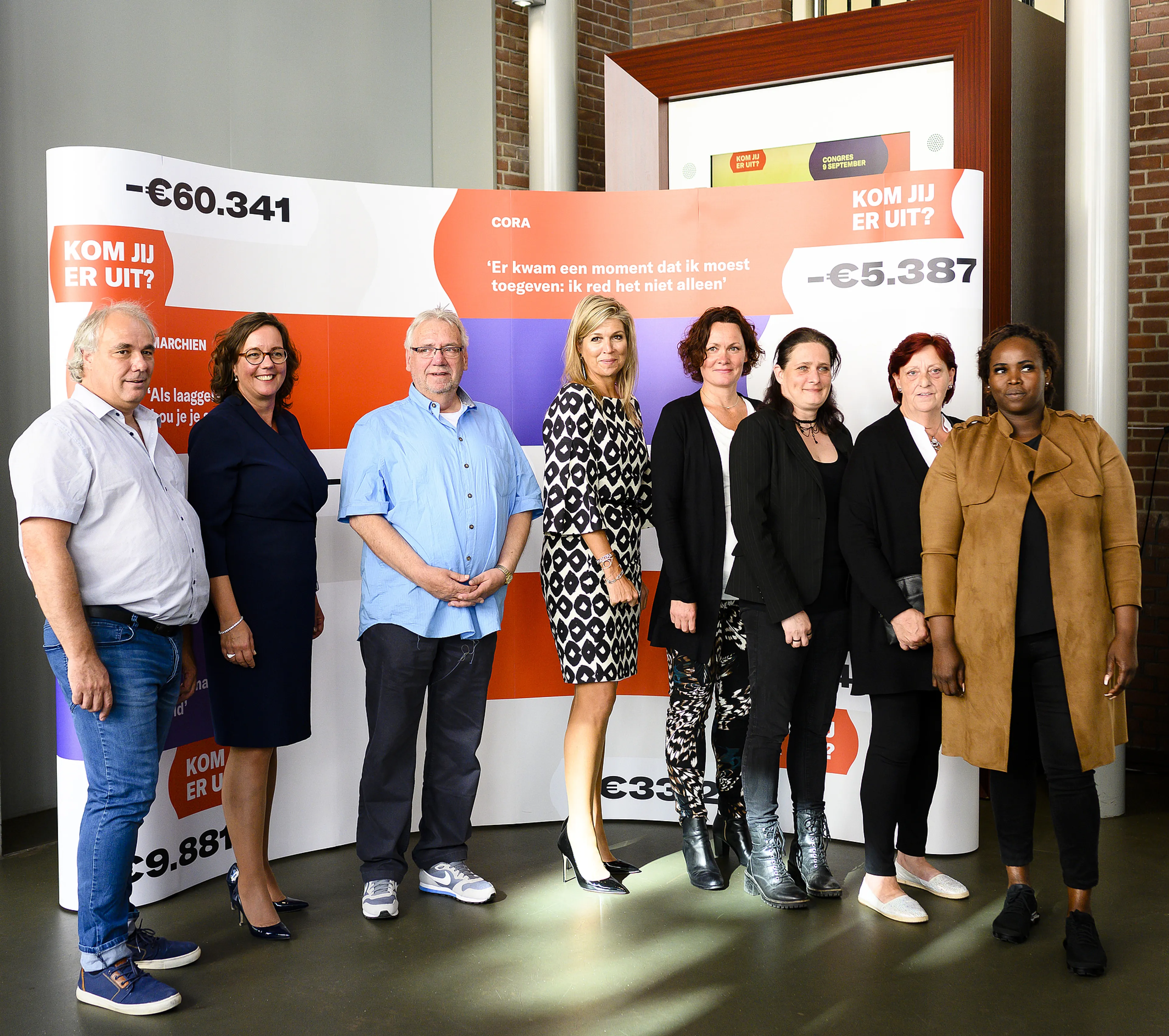Koningin Máxima sprak onder meer de aanwezige organisator staatssecretaris Tamara van Ark, het bestuur en met mensen die zelf te maken hebben gehad met schulden. Zoals Anneke, die in de schulden raakte door verschillende psychoses. Marc had jarenlang een spelletjeswinkel, maar door verschillende onverwachte situaties kwam hij diep in de schulden. Marc en Anneke zijn nu ambassadeurs van 'Kom uit je Schuld' en willen door hun verhaal te vertellen andere mensen helpen.