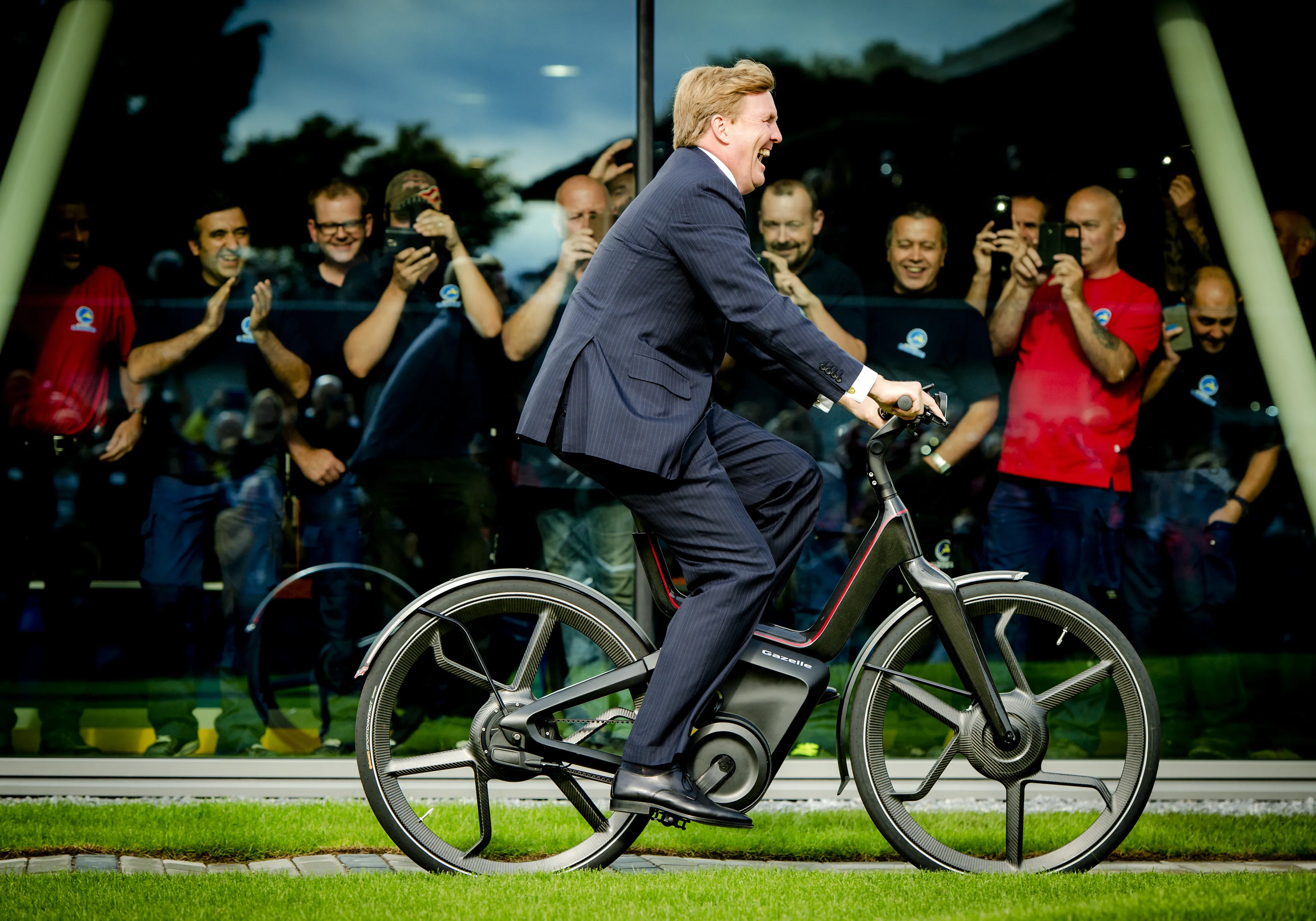 In 2015 stapt koning Willem-Alexander op de 'fiets van de toekomst' tijdens de opening van een fietsfabriek in Dieren, waar hij wordt aangemoedigd door alle aanwezigen langs de kant. Het tafereel levert deze leuke foto's op.