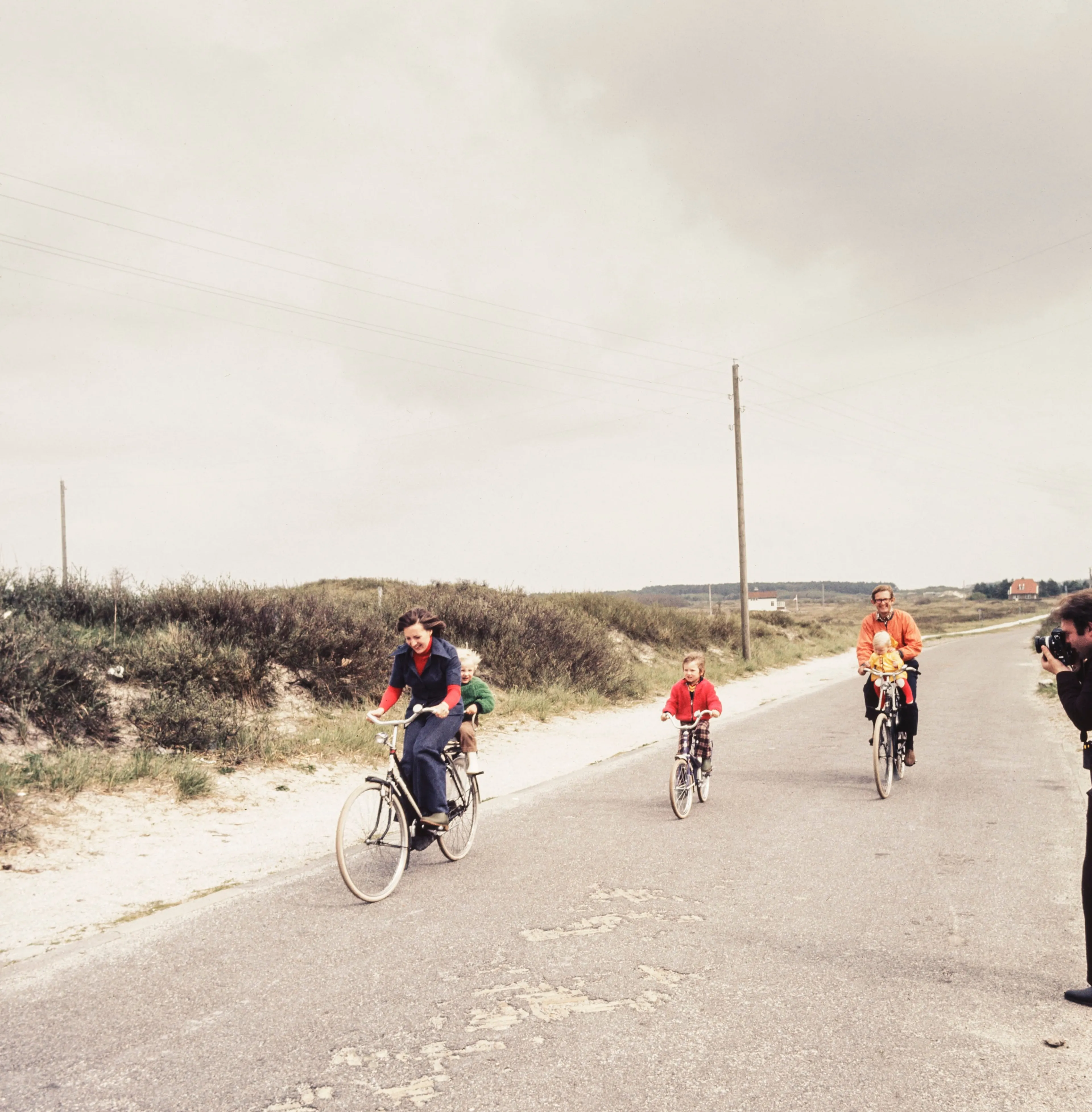 Ook de familie Van Vollenhoven zien we ook vaak op de fiets. Op deze foto uit 1973 zien we het gezin fietsen door de duinen. Prinses Margriet heeft prins Bernard jr. achterop de fiets en Pieter van Vollenhoven neemt prins Pieter-Christiaan onder zijn hoede. Oudste zoon prins Maurits kan al zelf fietsen.