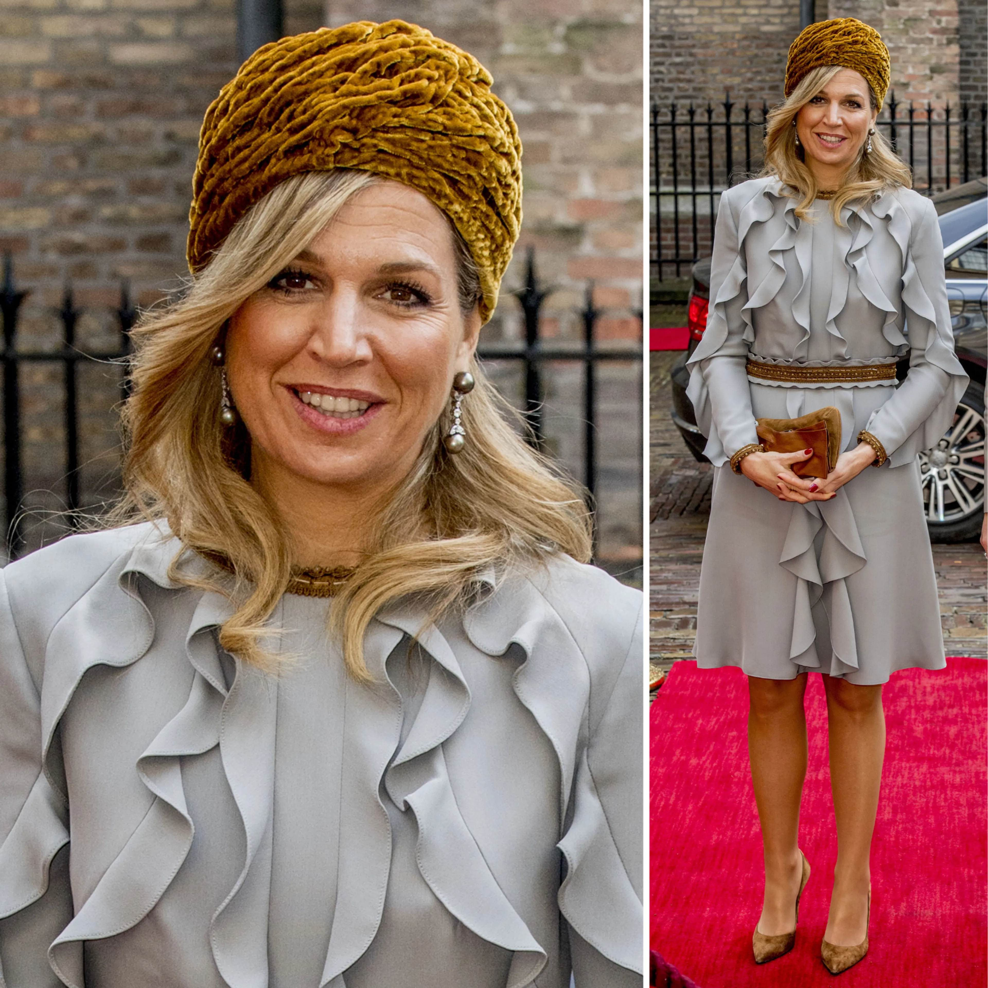 Koningin Máxima trekt haar grijsblauwe jurk aan en combineert het kledingstuk dit keer met een andere hoed. Dit levert dan ook een totaal ander plaatje op. De fluwelen turban werd eveneens ontworpen door Fabienne Delvigne.