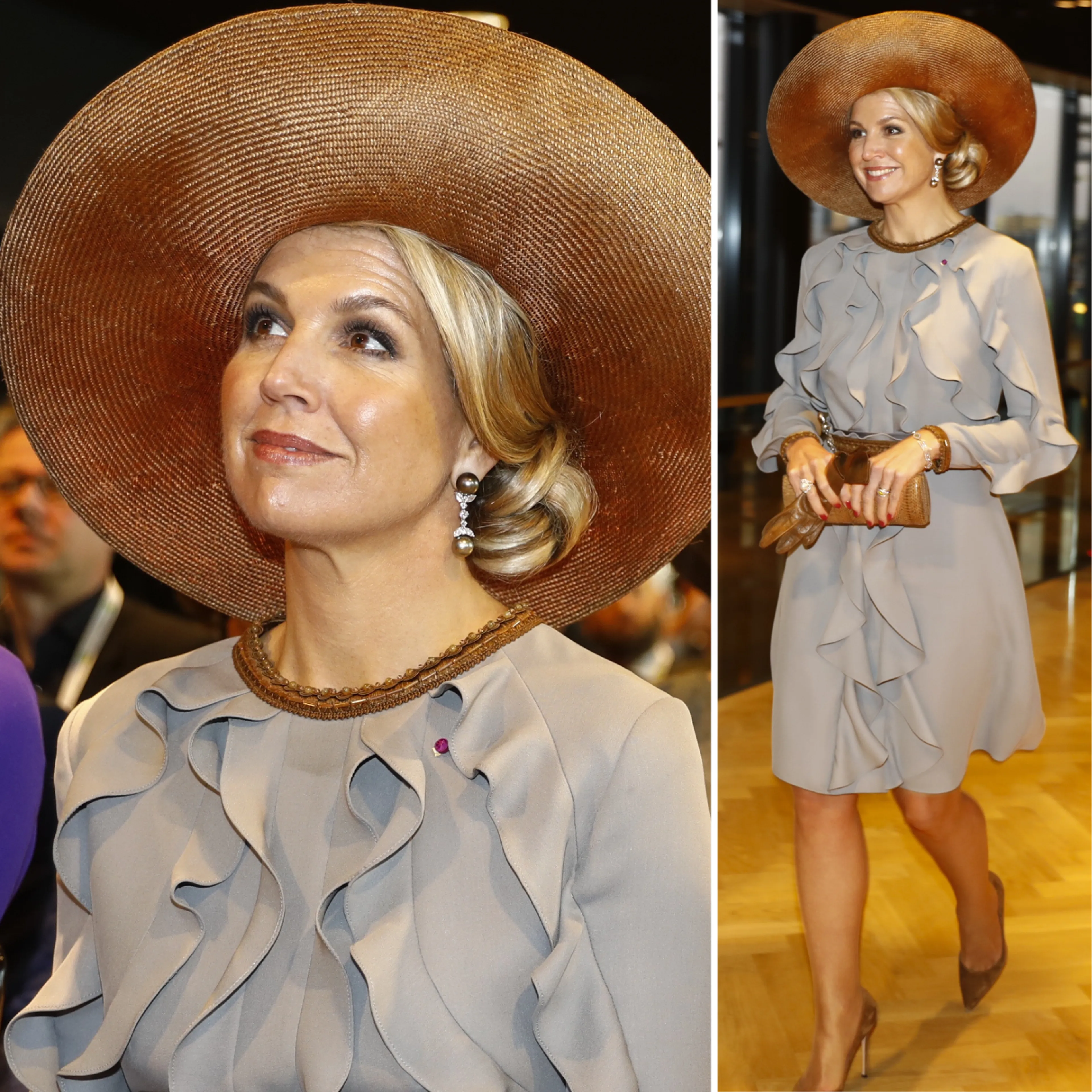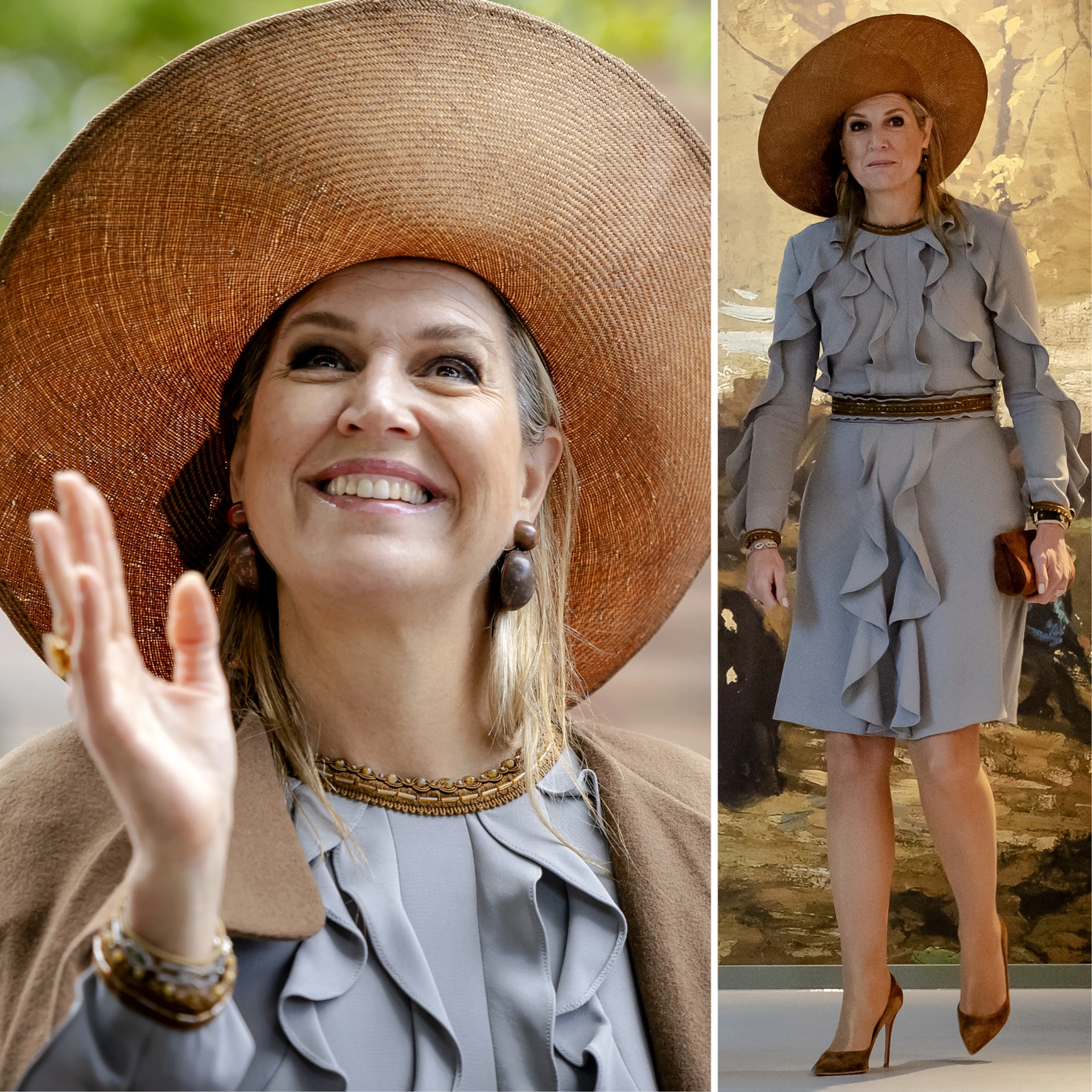 Vijf jaar geleden zagen we Máxima's grijsblauwe japon dus voor het laatst. Tót deze week! De koningin combineert de jurk, net als toen ze het kledingstuk voor het eerst droeg, met een grote bruine hoed. Wat een plaatje!