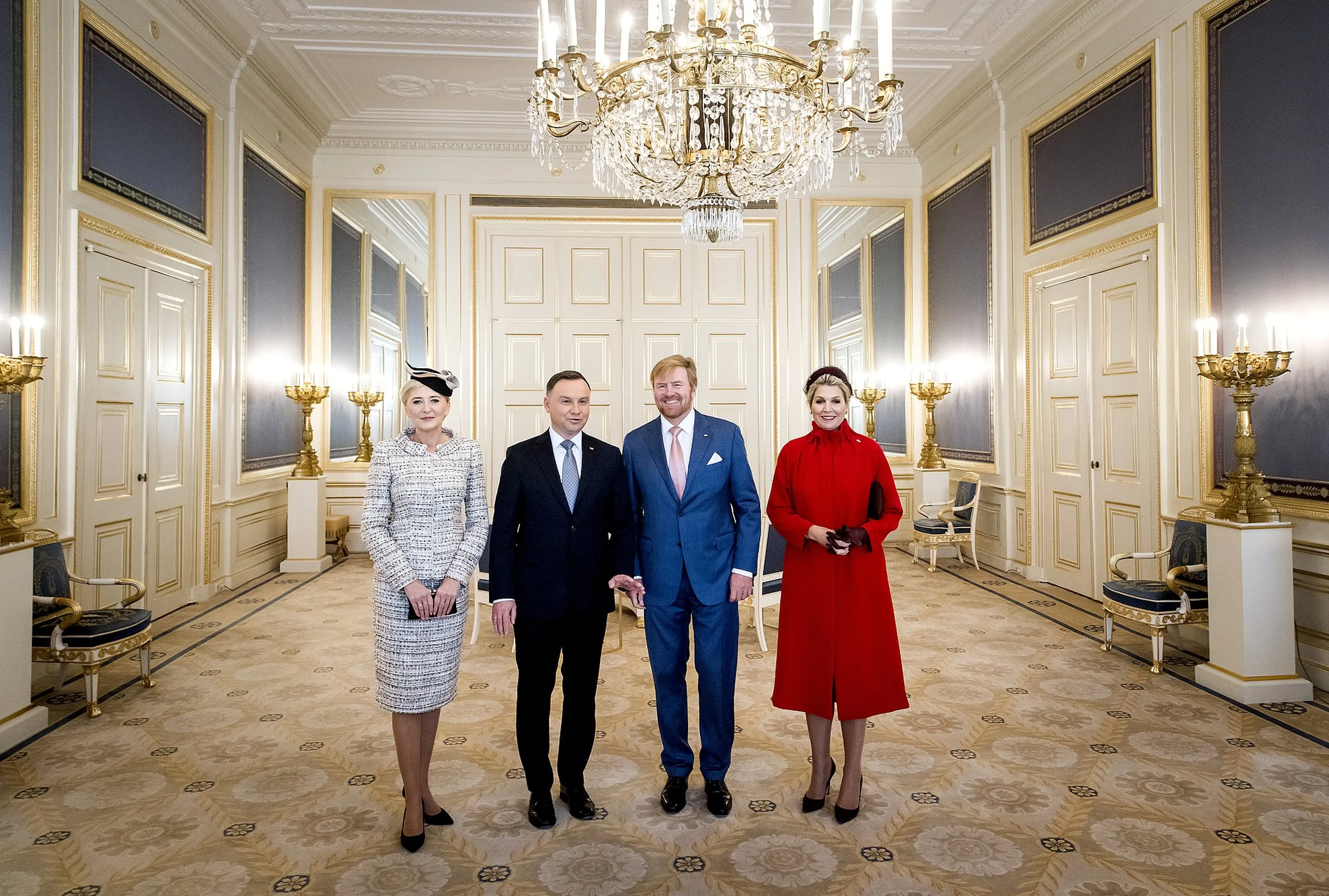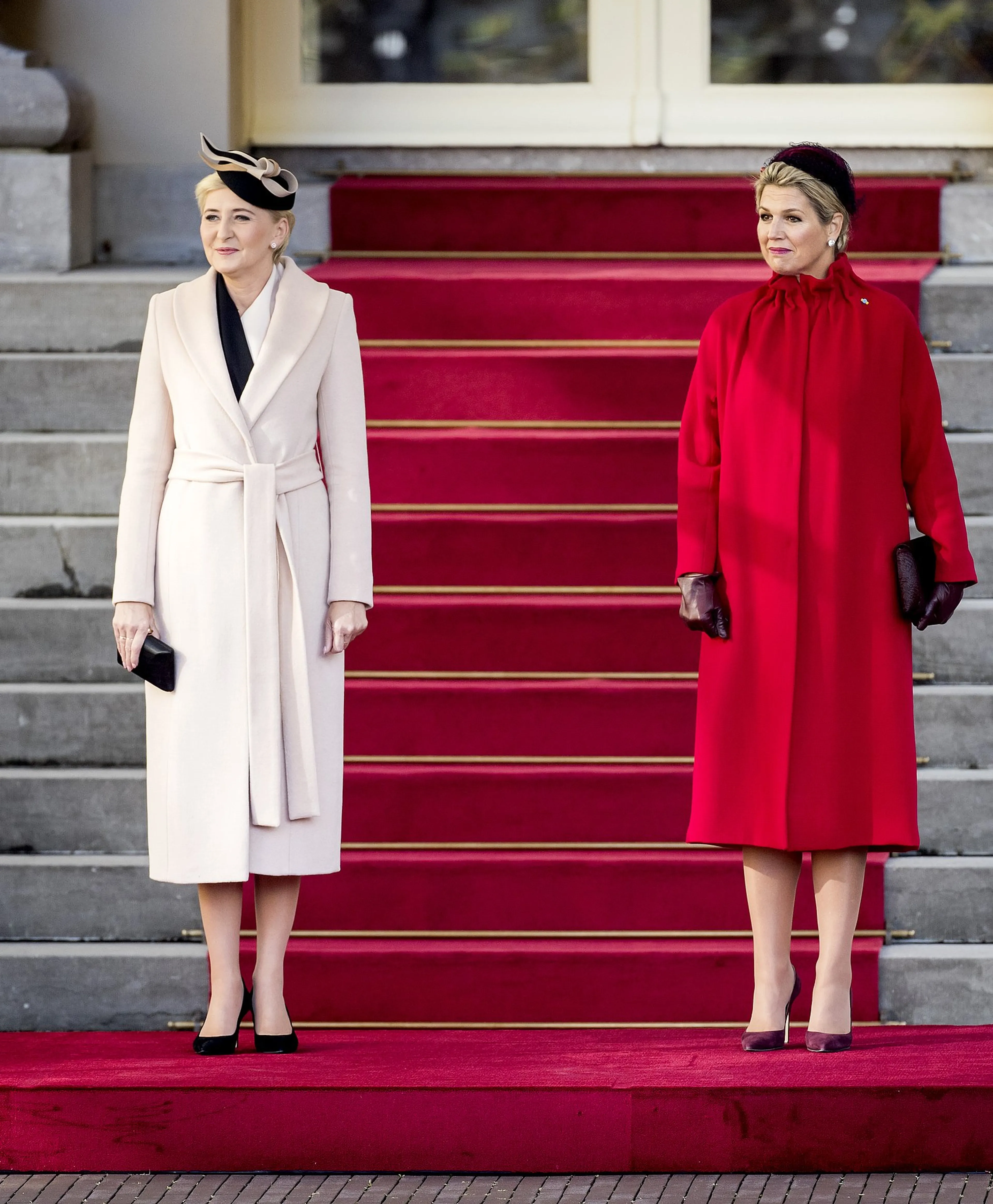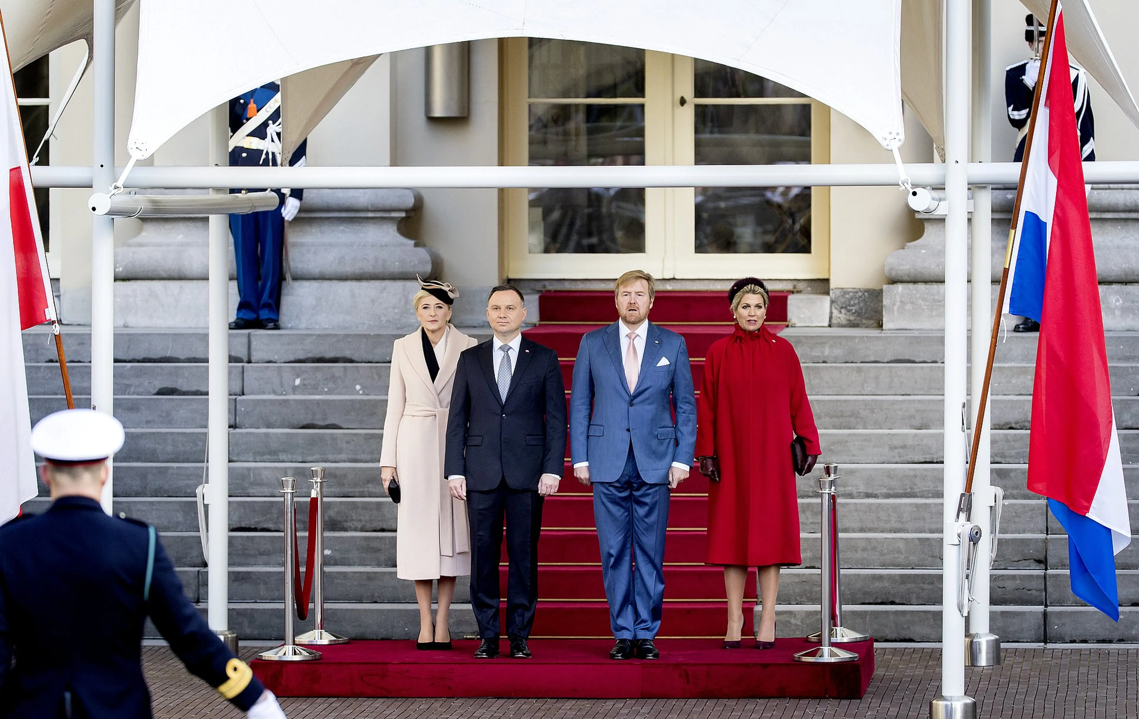 Koningin Máxima koos dinsdag voor het bezoek van de Poolse president Andrzej Duda en zijn vrouw Agata Kornhauser-Duda voor een toepasselijke outfit. Bij ontvangst droeg ze een rode mantel met een opstaande kraag van modehuis Natan. Deze kleding past in de trend van 'flagdressing'.