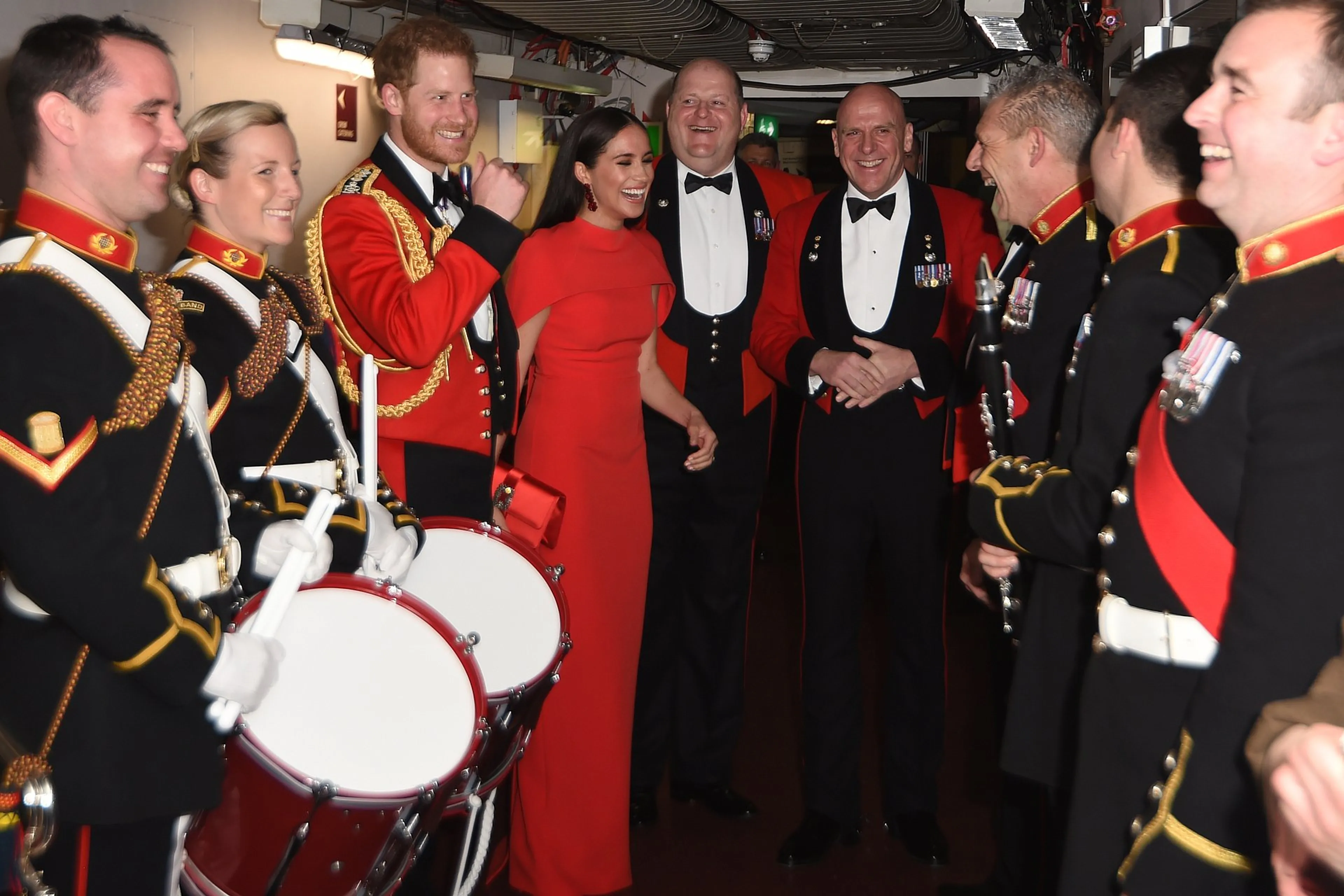 Ze woonden het evenement bij in de rol van Harry als kapitein-generaal van de Royal Marines. Achter de schermen maakte het stel kennis met de bandleden, met wie het koninklijk paar lachte en grapjes maakte voordat ze het podium op gingen om meer aanwezigen en muzikanten te ontmoeten.